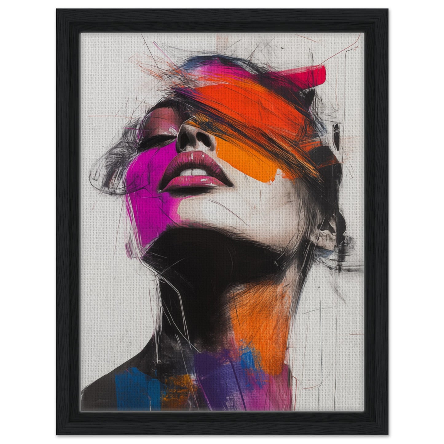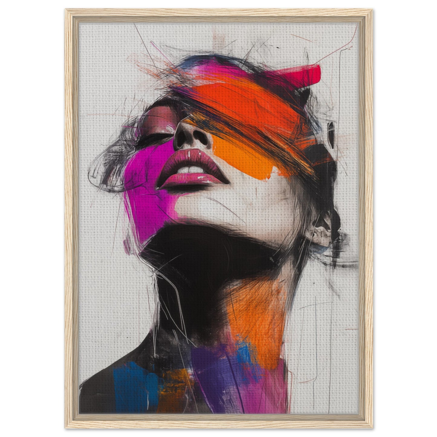 "Abstract Color Explosion" is a vibrant portrait of a woman, working with intense colors such as bright orange and deep magenta. The partially obscured depiction of the face and the powerful brushstroke create a dynamic and expressive atmosphere. The mix of bold color accents and fine lines gives this work a modern and avant-garde touch. This artwork is ideal for rooms looking for a creative, energetic and modern aesthetic and sets an expressive accent on any wall.
