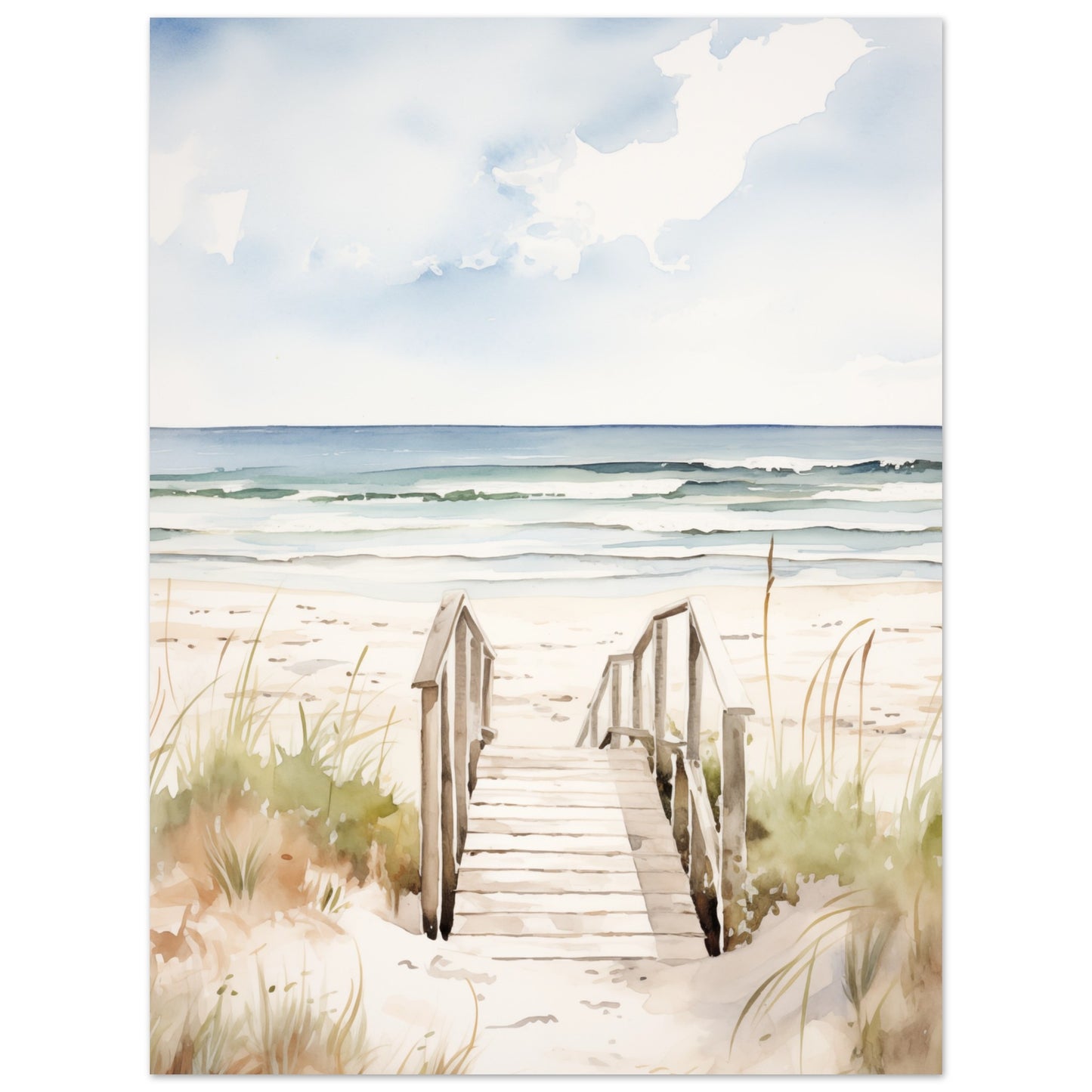 Experience the allure of a tranquil beach with this poster , which features a picturesque wooden staircase leading through the dunes straight to the sea . The delicate watercolor colors and light, airy design add a refreshing touch of calm and freedom to any room. Perfect for living rooms and bedrooms, this artwork brings the calming beauty of the coast into your home.