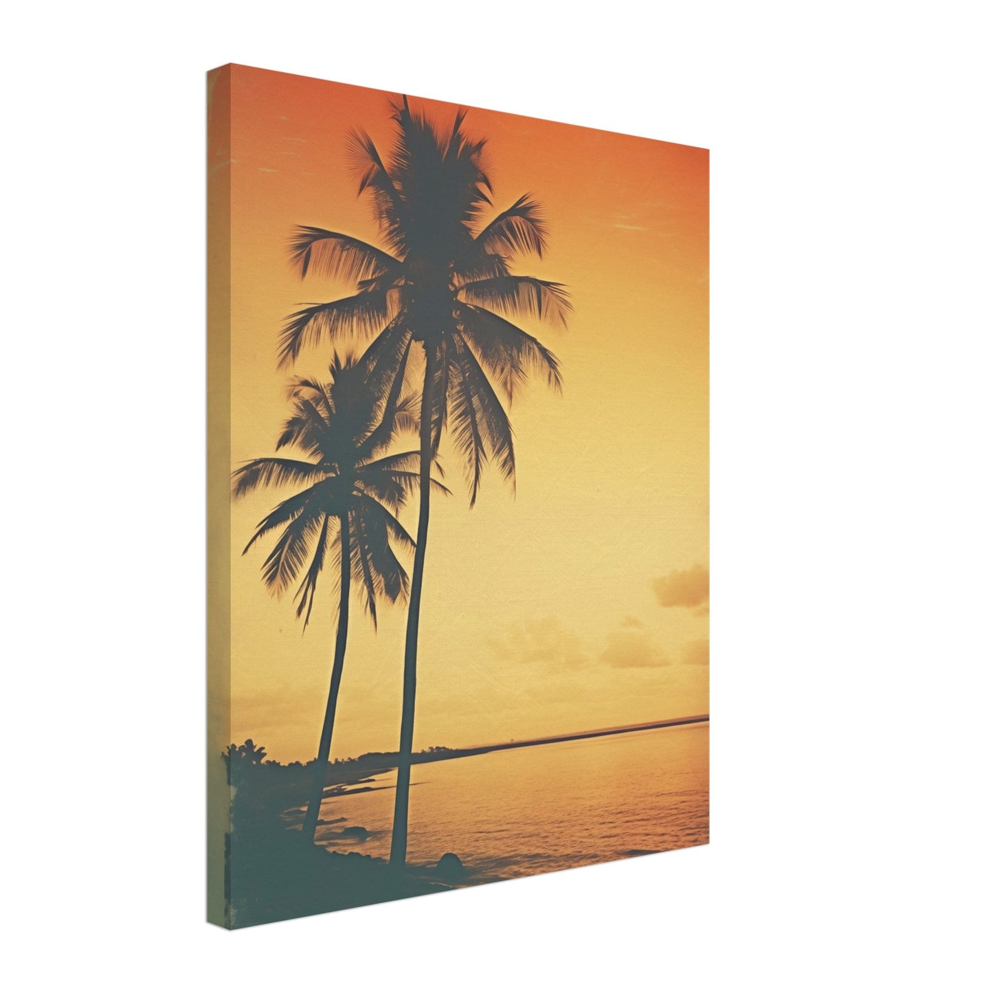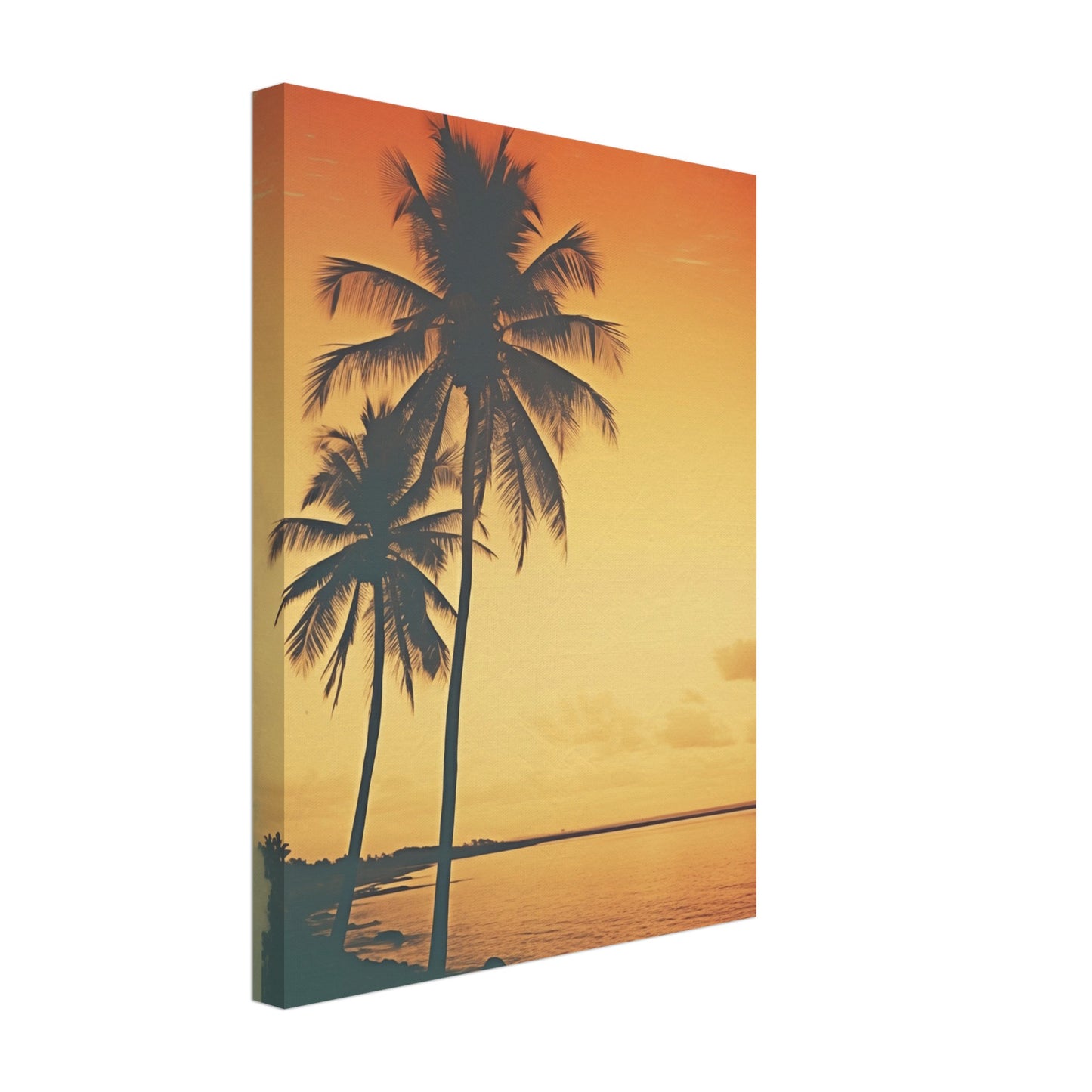 Evening Calm in Tangerine is a peaceful artwork that captures the moment of a tropical sunset. Two palm trees tower in the foreground, their dark silhouettes contrasting with the warm orange tones of the sky. The gentle waves of the sea reflect the last rays of daylight, creating an atmosphere of serenity and calm. This image invites you to pause and dream, ideal for modern spaces that want to create a relaxing and warm atmosphere.