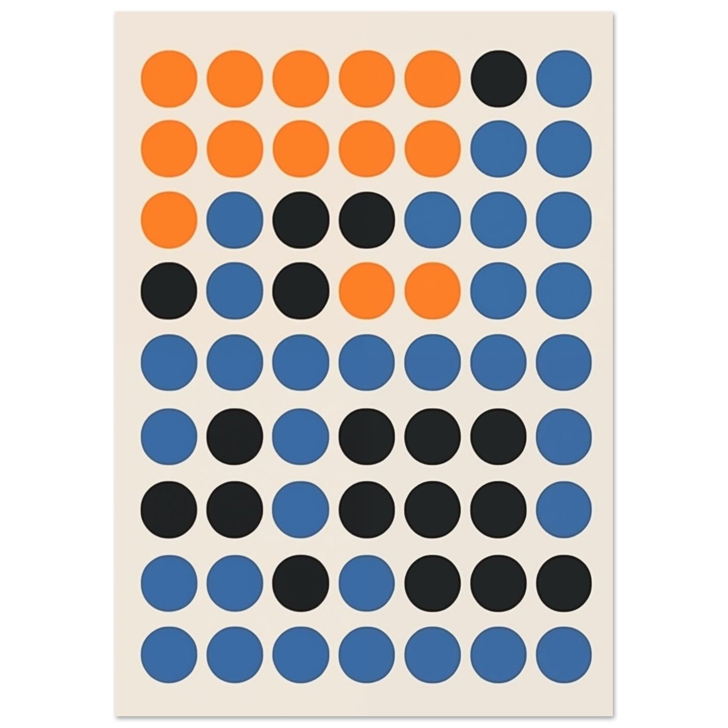 This modern abstract artwork features a fascinating composition of colorful circles in a textured grid. The color combination of blue, orange, and black lends the design a harmonious balance, making it a stylish eye-catcher for any interior. Ideal for lovers of minimalist and geometric art.