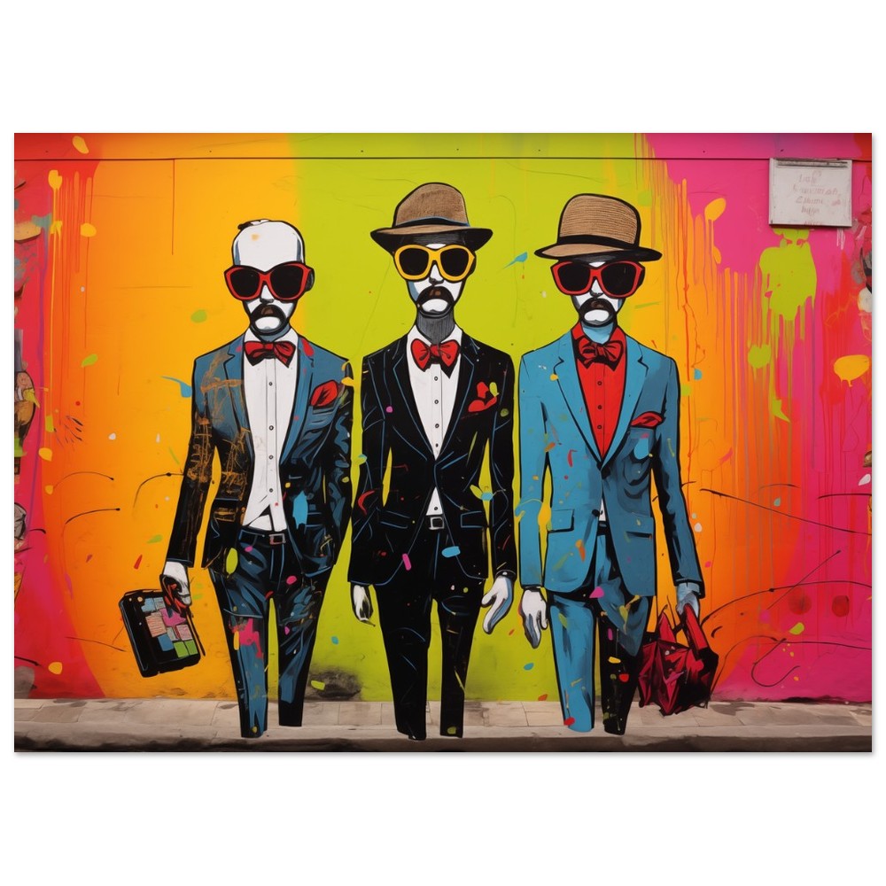This depiction of three men in suits combines classic elegance with a modern street art touch. The men's sophisticated coolness is underlined by a dynamic background in bold, bright colors. The contrasts between the classic style of the suits and the urban, artistic background create a harmonious tension and make this image a real eye-catcher. It appeals to lovers of both classic fashion and contemporary art.