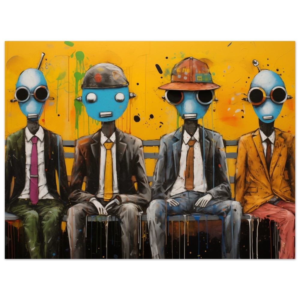 "Contrast of Life" features four stylized figures that, despite their uniform appearance, appear unique due to yellow and blue tones on a yellow background. The artwork represents the tension between individuality and conformity in society by highlighting the differences of the figures despite their similarity. The color scheme enhances the visual contrast and symbolizes the diversity that exists in human nature, even if the outward appearance suggests uniformity.
