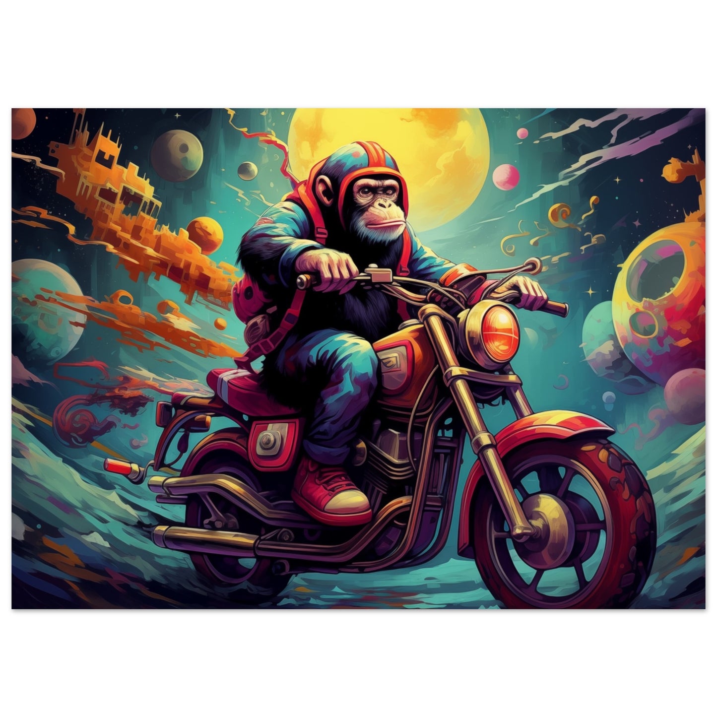 This imaginative artwork shows a monkey relaxedly driving a motorcycle while moving through a cosmic space and time background. The bright colors and dynamic depiction convey a feeling of limitless freedom and adventurousness. The monkey seems like an experienced traveler embarking on an extraordinary journey through the universe.