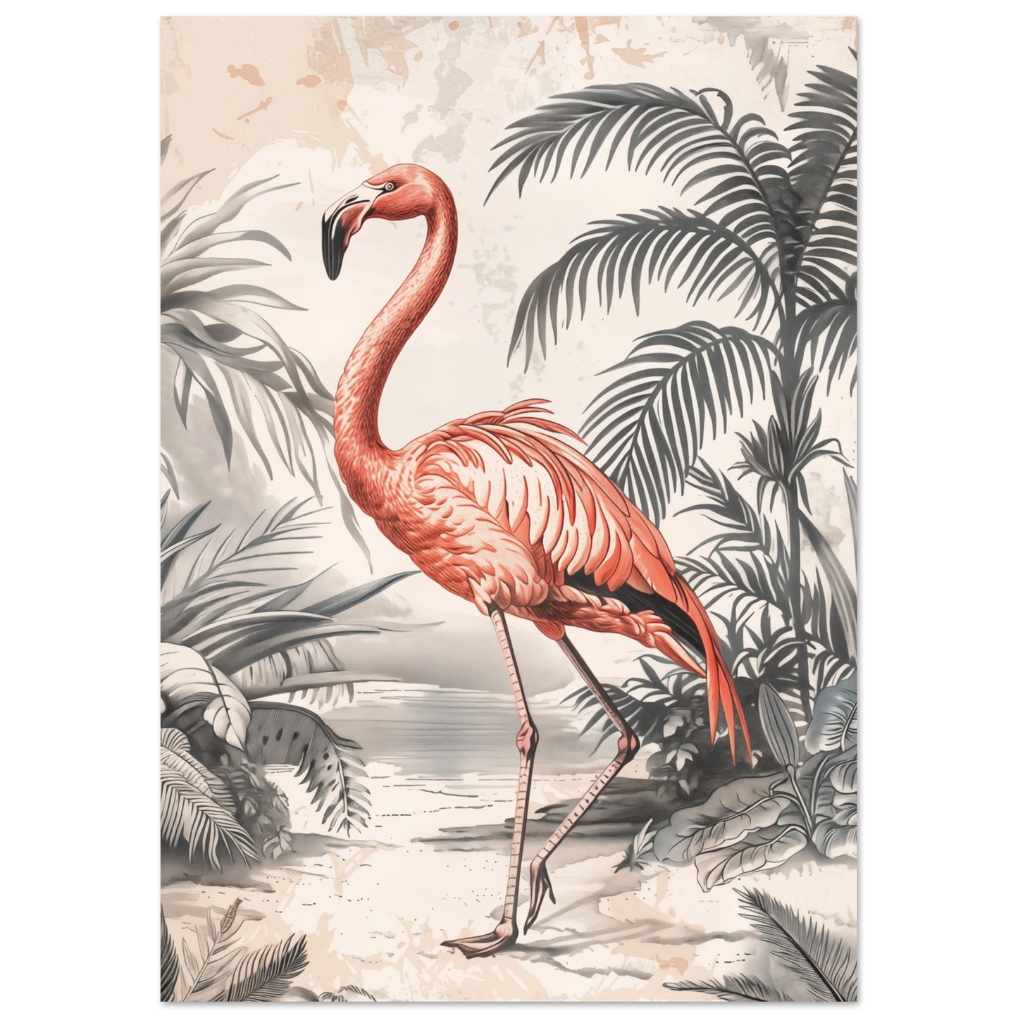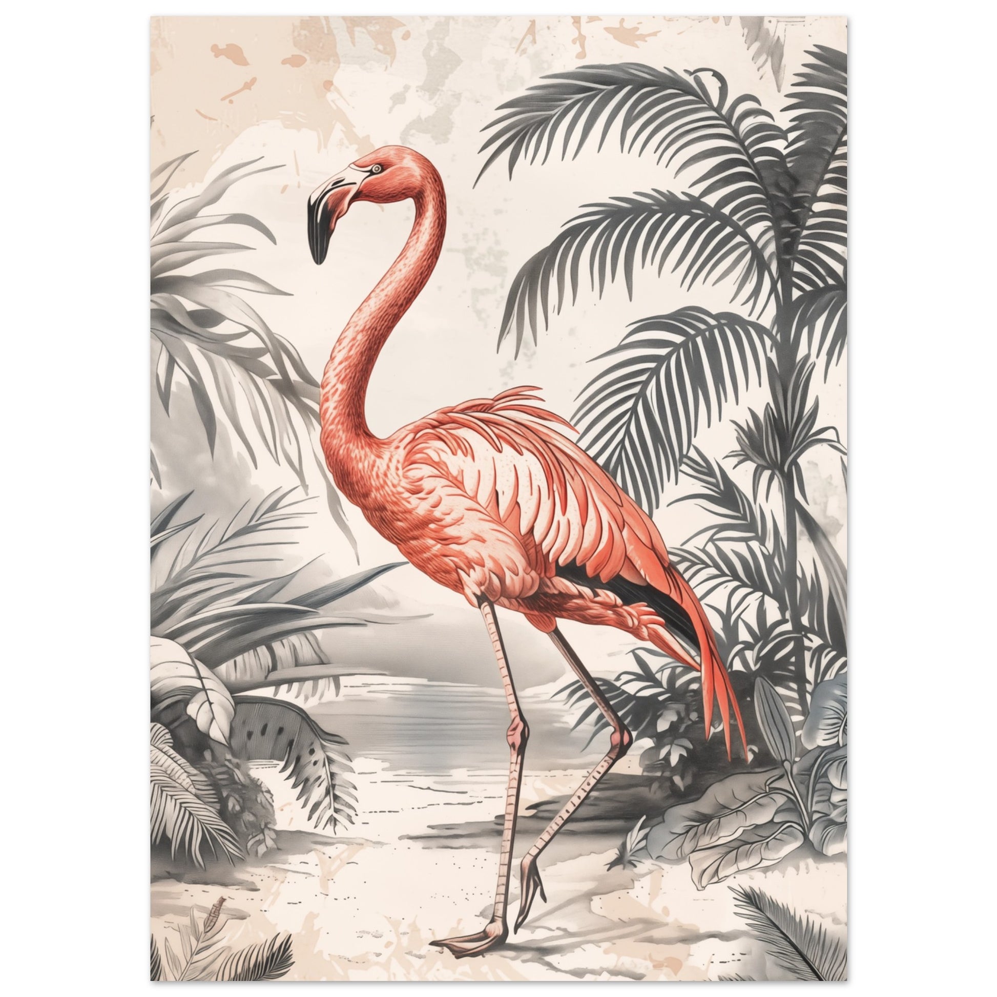 At the center of this exotic composition, a majestic flamingo radiates in rich pink and rust tones. The soft background of beige and cream is broken up by vibrant green tones of tropical vegetation, creating a calming yet colorful atmosphere. This artwork captures the spirit of a distant coastal landscape and exudes calm and exoticism. Perfect for rooms seeking a harmonious blend of nature and elegance.