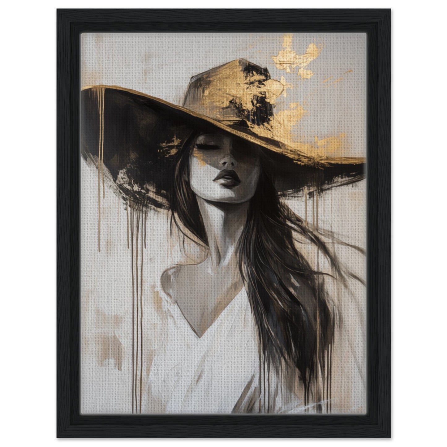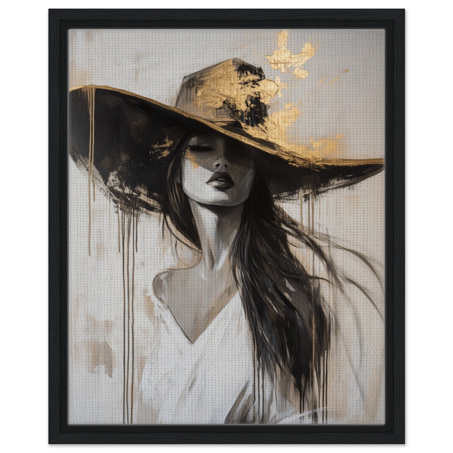 This impressive abstract portrait in black and white shows an elegant woman wearing a large hat, which is partially decorated with gold accents. The combination of flowing lines and structured details gives the artwork a modern yet luxurious touch. The subtle gold accents add a unique depth and make this portrait a real eye-catcher. Ideal for lovers of modern art who want to give their room a special highlight.