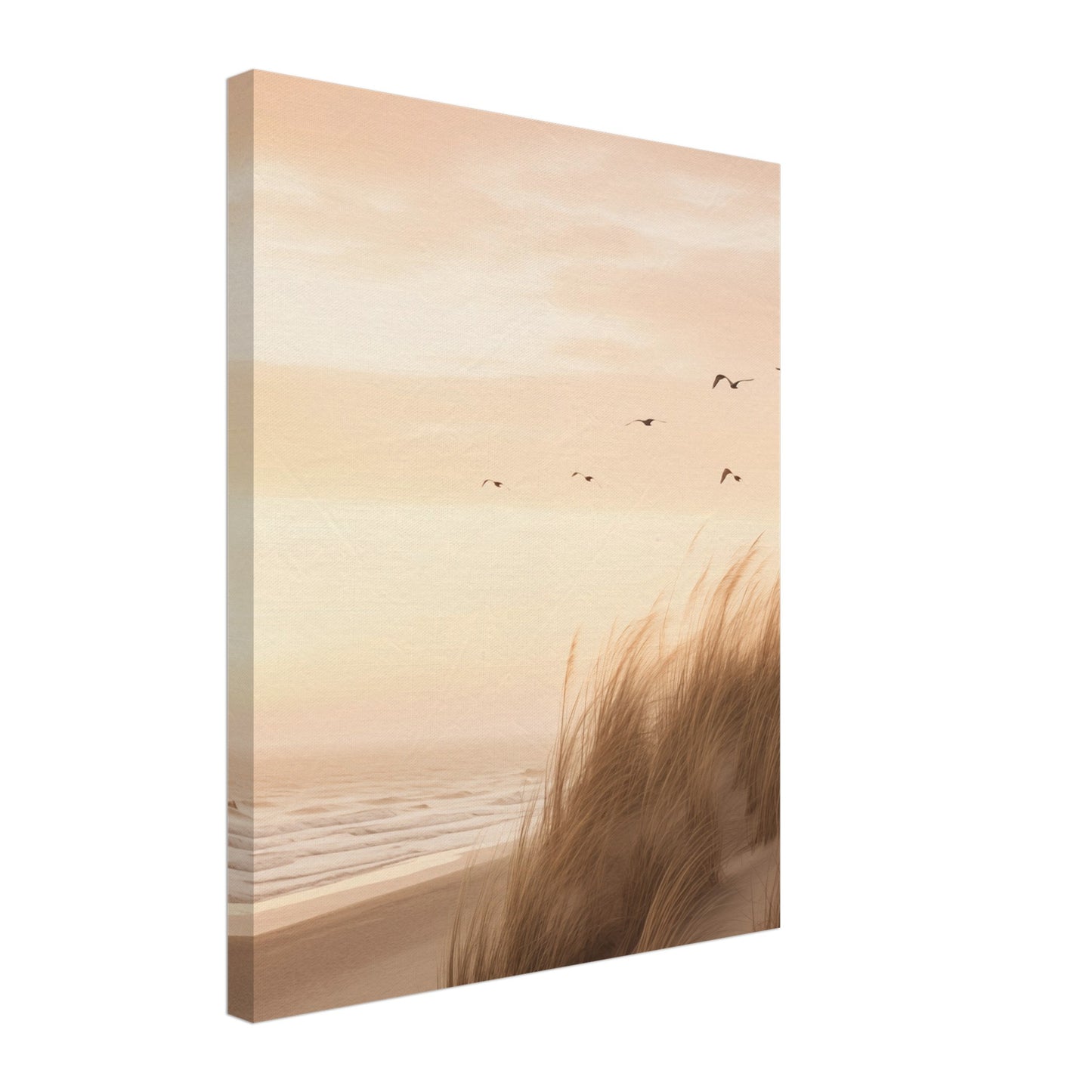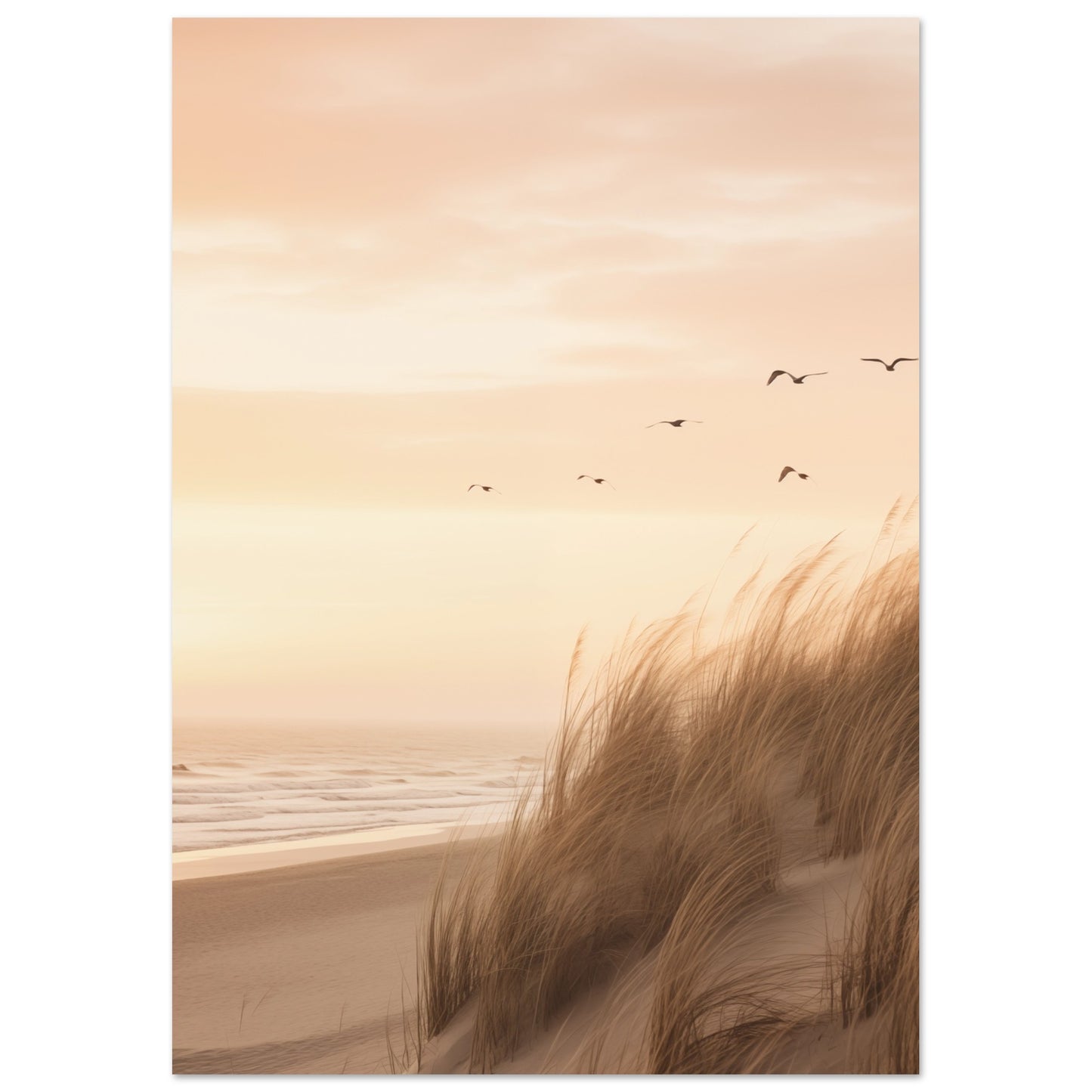Experience the peaceful beauty of sunset with our 'Flight into the Twilight Sky' poster. This striking depiction of the coast at sunset features birds soaring elegantly into the pastel sky as gentle winds sweep across the dunes. The image captures the essence of freedom and inner peace, bringing the tranquility of a pristine beach into your home. Ideal for any room seeking an atmosphere of stillness and movement.