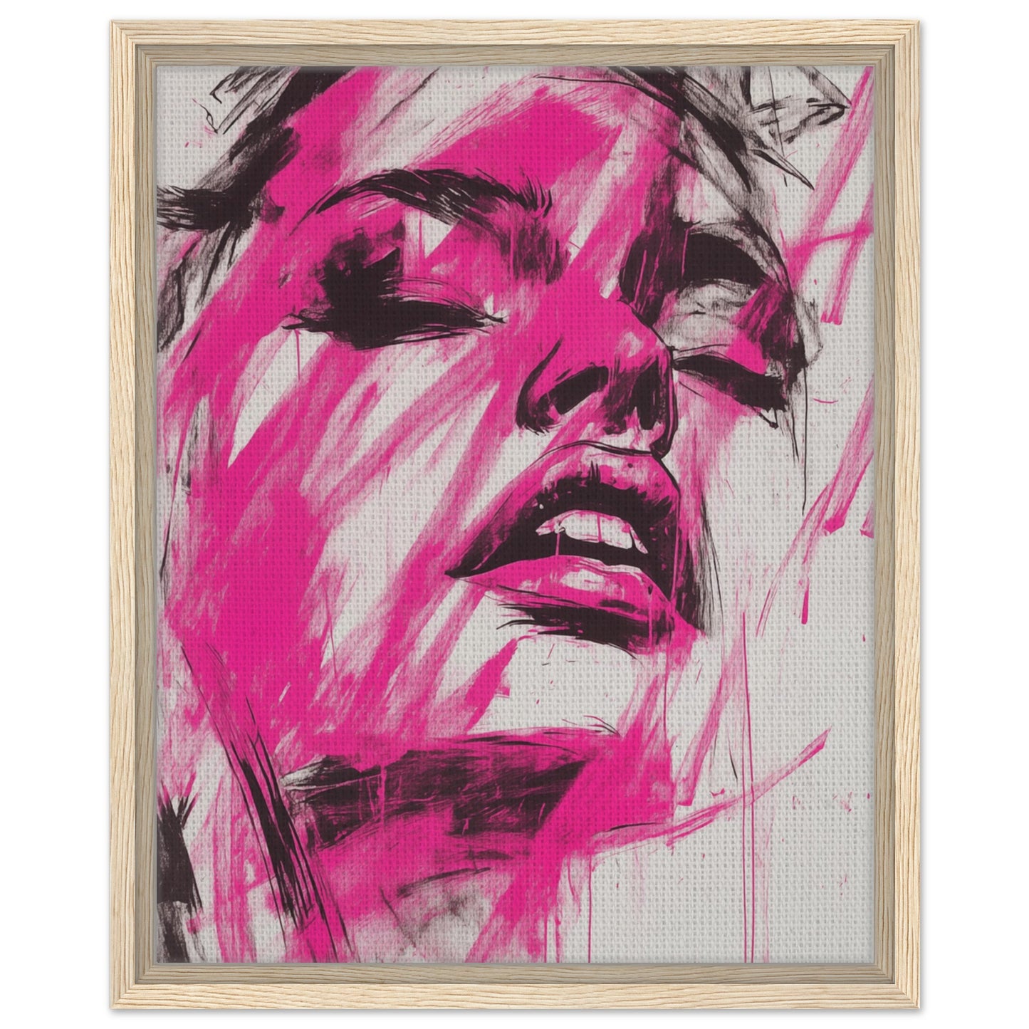 "Fuchsia Explosion" is an intense, abstract portrait that dominates the canvas with bold fuchsia colors and dynamic black accents. The bold, rapid brushstrokes and expressive design convey a powerful energy that gives the portrait an emotional depth. Ideal for modern spaces looking for a bold, colorful statement, this mixed media artwork brings dynamism and creativity to any environment.