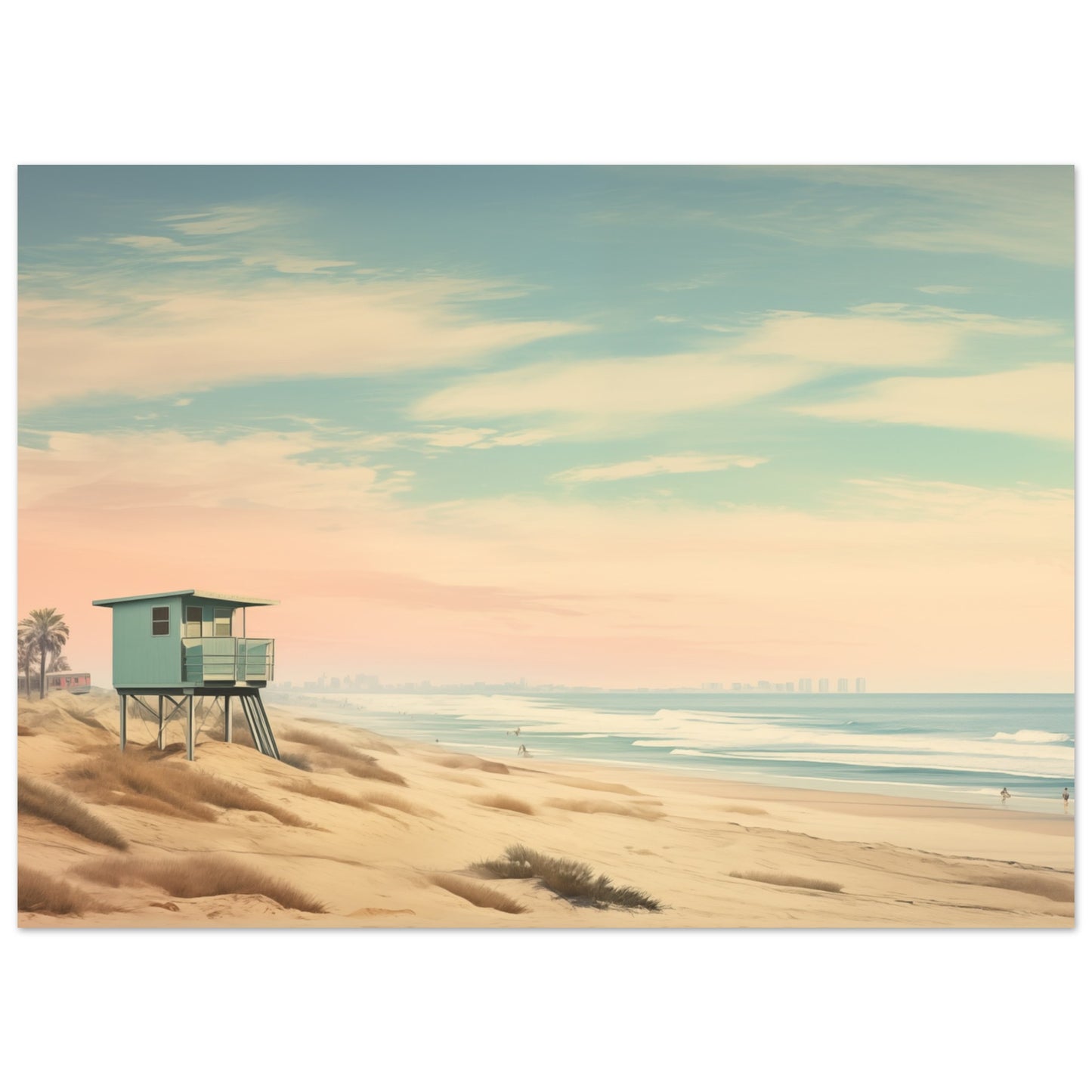 "Guardian of the Sea" is an atmospheric poster that captures the quiet serenity of a beach guardhouse on the coast. The soft color palette, consisting of delicate blues and beiges, creates a calming atmosphere that is perfect for rooms that should exude a feeling of relaxation and peace. The image transports the viewer to a world of the sound of the sea and quiet beach days and is ideal for minimalist and maritime interior styles.