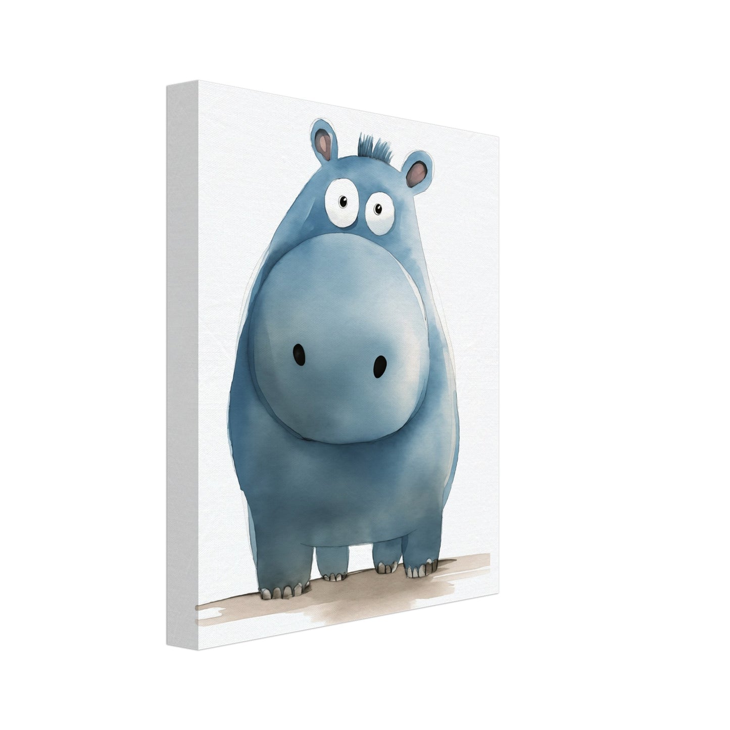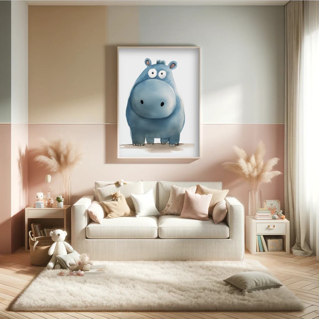 "Gumpy" the good-natured hippo, with his soft, blue fur and gentle, large eyes, brings an atmosphere of calm and contentment. Despite his powerful stature, Gumpy spends his days relaxing in the water, where he peacefully reflects on the little joys in life. This picture radiates serenity and warmth, ideal for a child's room or as a humorous and calming decoration in a room that needs a pinch of friendliness.