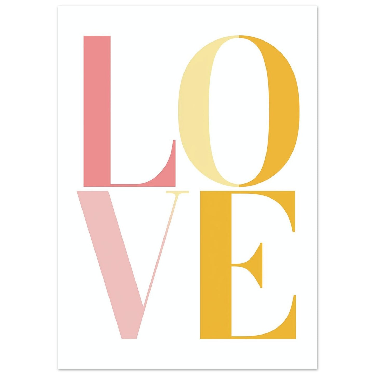 This stylish typography poster showcases the most beautiful of all words: LOVE. With its soft pastel colors of pink, yellow, and cream, it's a real eye-catcher and lends any room a warm, loving atmosphere. Ideal as a wall decoration for the bedroom, living room, or as a gift for special people.