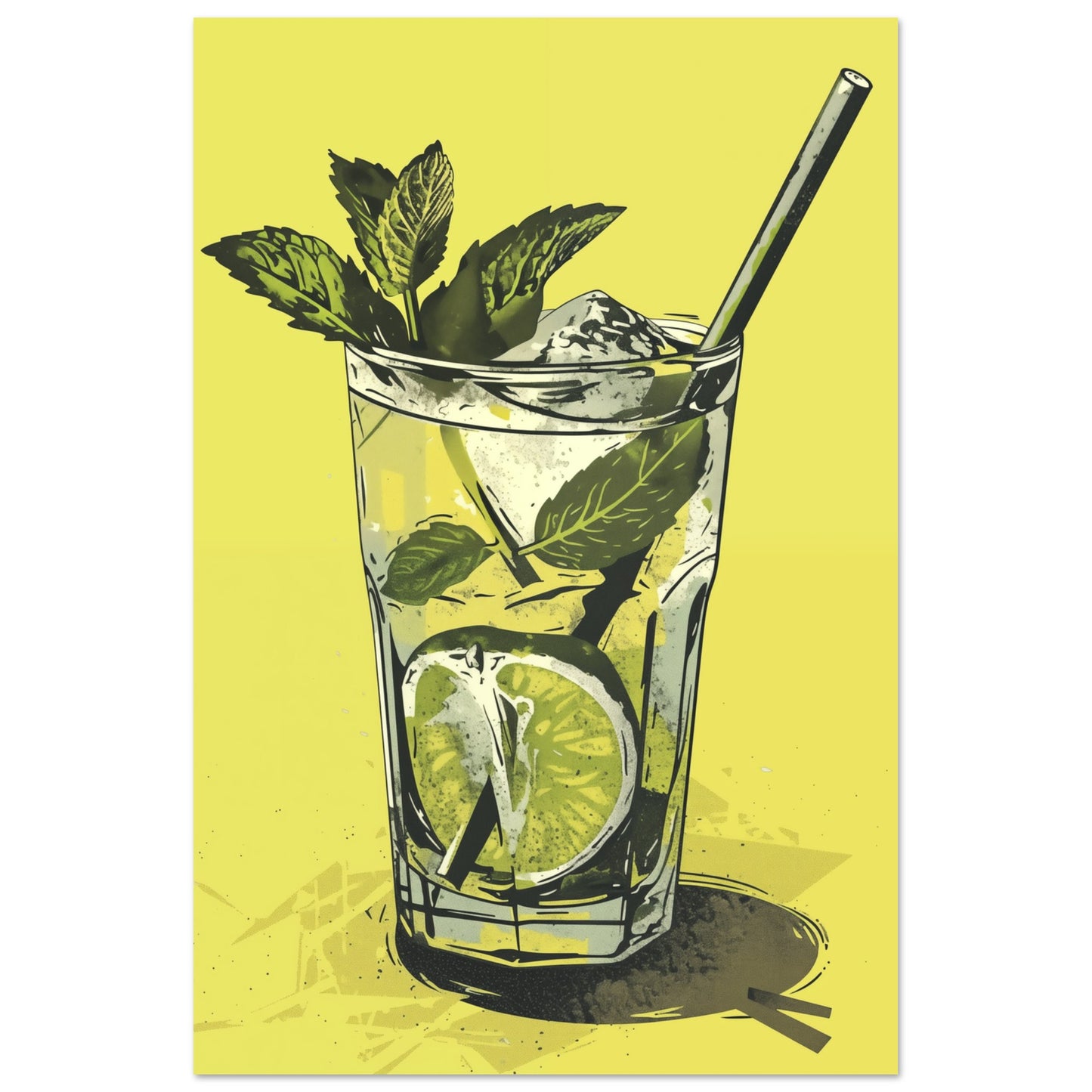 This vintage-inspired image of a mojito cocktail perfectly captures the classic style and refreshing essence of this popular drink. In the tall glass, fresh mint leaves and lime slices float in clear liquid, interspersed with ice cubes. The vibrant yellow background enhances the summery vibe and gives the image a warm, inviting feel. Ideal for retro-inspired kitchens or bars, this image will bring both nostalgia and freshness to any room.