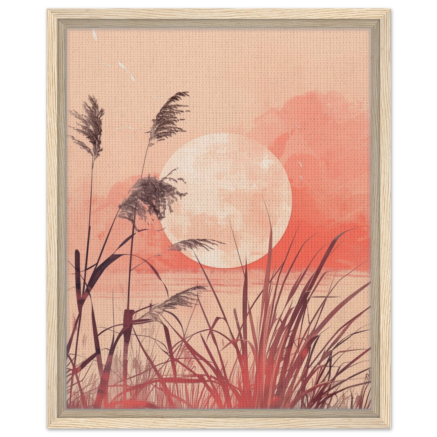 This artwork depicts a peaceful scene under a large, glowing moon . Grasses and plants are depicted in soft red tones against an evening sky, creating a warm and inviting atmosphere. Perfect for spaces that require a calming and inspiring mood.