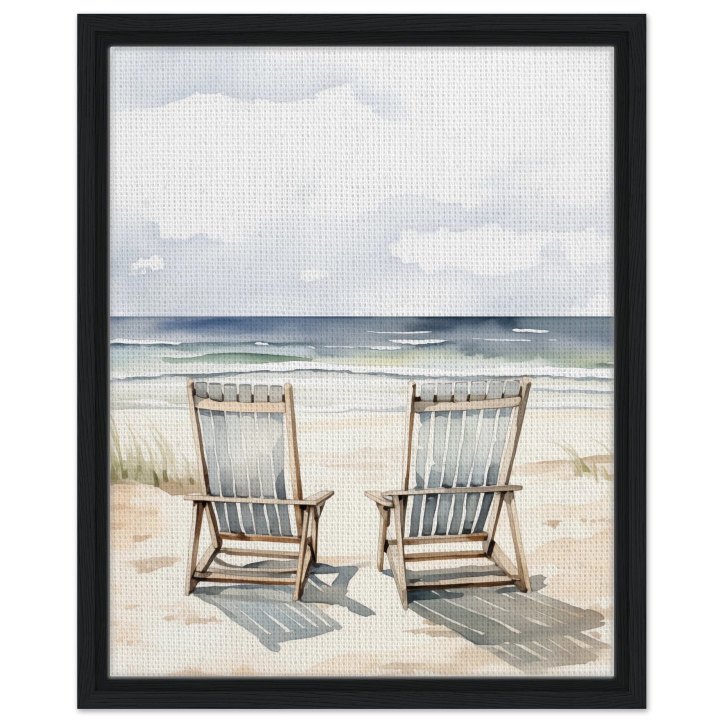 Dieses Bild zeigt zwei Adirondack-Stühle am Strand, eingefangen in weichen Wasserfarben. Es vermittelt das Gefühl der Gelassenheit eines sonnigen Strandtages. Die subtile Darstellung der Wolken und des sanften Wellengangs verstärkt die entspannende Atmosphäre, ideal für Wohn- oder Arbeitsräume, die eine beruhigende Wirkung erfordern.