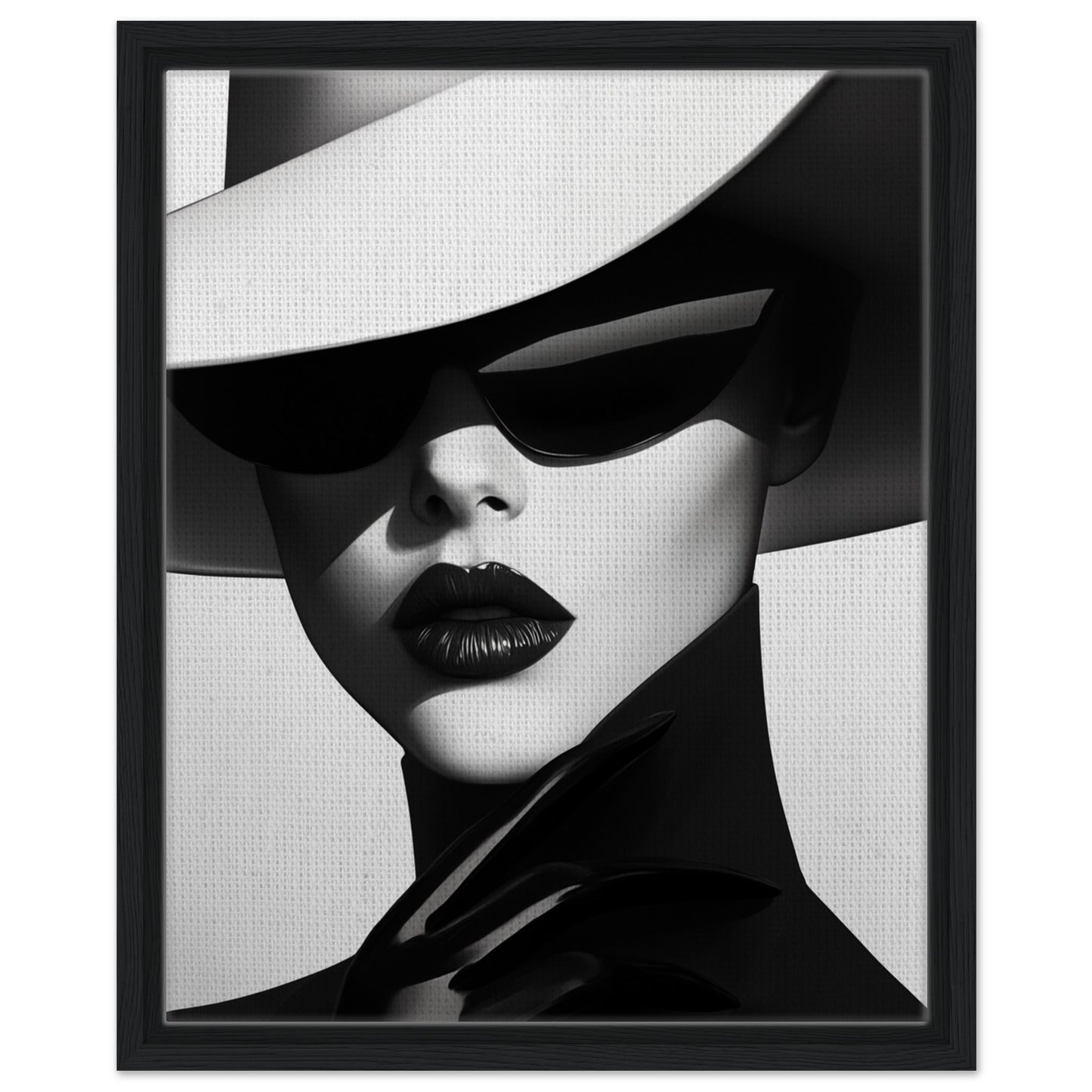 "Stylish Modernism" is a contemporary, highly stylized portrait depicting a mysterious woman in black and white, dressed in an elegant hat and sunglasses. The minimalist contrasts between black and white, combined with the high gloss of the lips and gloves, convey a powerful and confident aesthetic. This image exudes sophistication and modern design, ideal for spaces that need a touch of luxury and fashion statement.