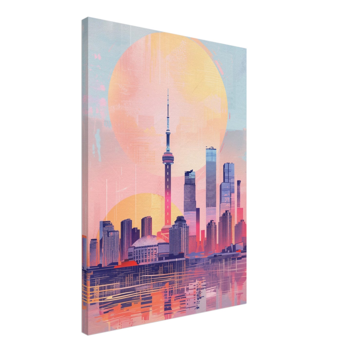 "Urban Twilight" features the peaceful silhouette of futuristic skyscrapers glowing in the soft light of a pastel morning. The rising moon, unusually shining against the morning scene, gives the city a mystical aura. The calm water reflects the impressive skyline, enhancing the mood of balance between movement and stillness. The illustration combines modern urban elements with nostalgic retro aesthetics to depict a city that feels both familiar and wonderfully alien. Perfect for living spaces looking for a mix of innovation and romance.