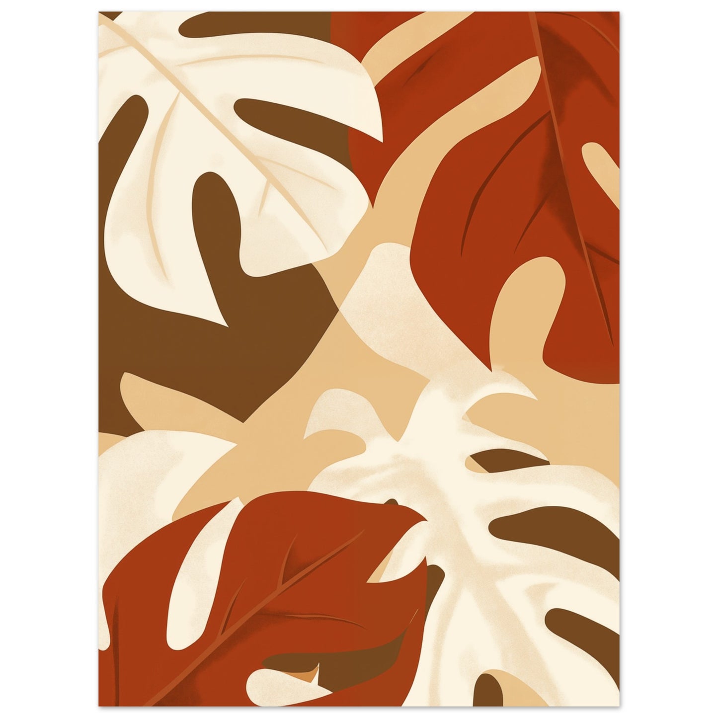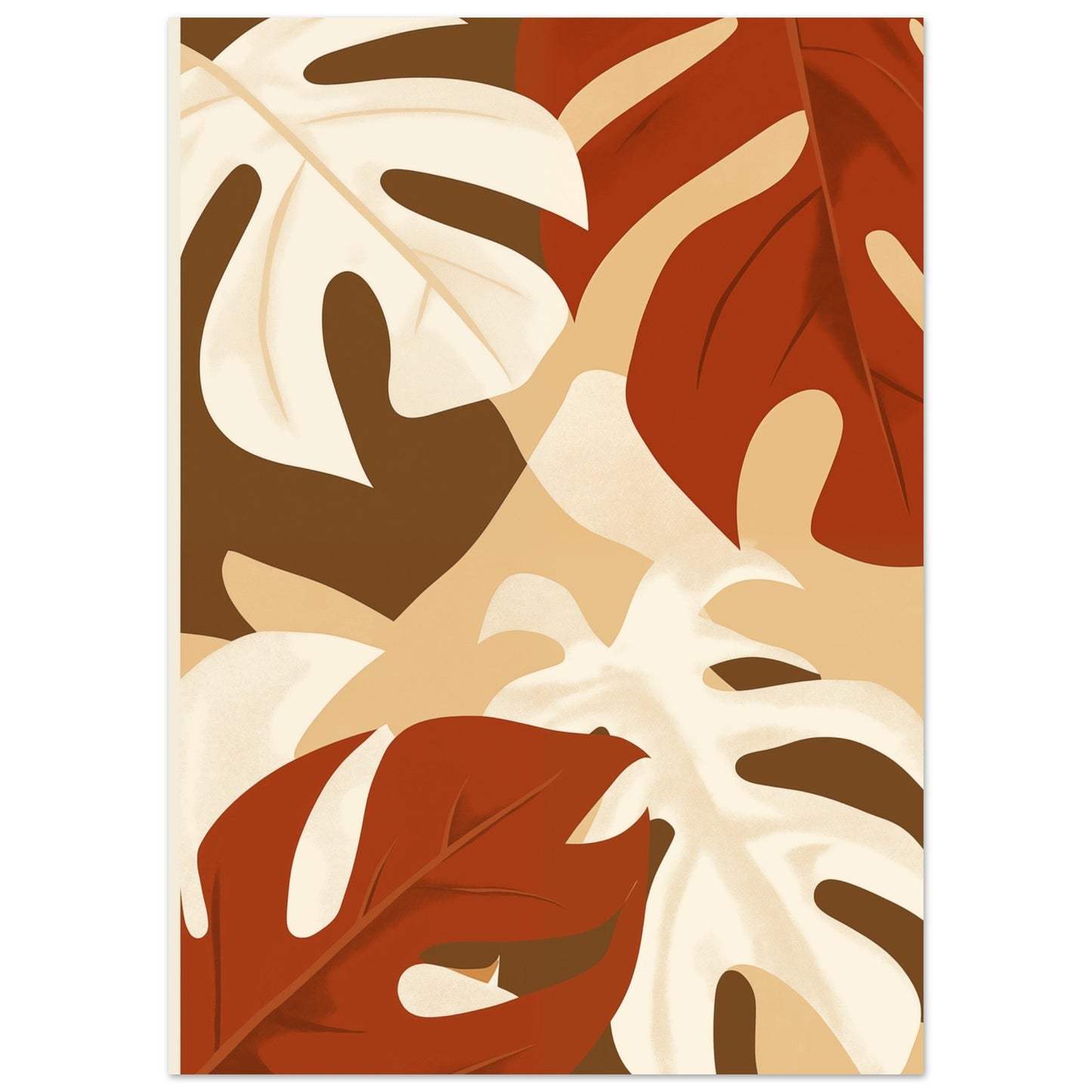 Présentant de grandes feuilles en terre cuite et beige dans un design d'inspiration rétro, cette affiche stylisée apporte une interprétation moderne et élégante de la nature à votre espace de vie. Avec son esthétique minimaliste et ses couleurs chaleureuses, il s'intègre parfaitement dans les décorations automnales. Idéal pour les amateurs d'élégance simple et d'ambiance automnale.