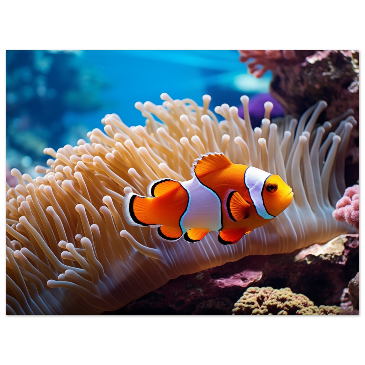 "Cachez-vous dans le récif" capture la beauté éclatante d'un poisson-clown intelligemment caché entre les tentacules doucement balancées d'une anémone de mer. Les couleurs vives et la richesse des détails du récif amènent le monde sous-marin directement chez vous.