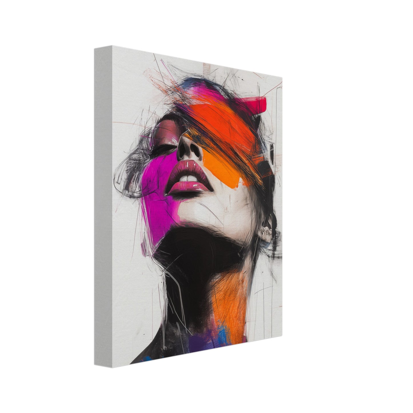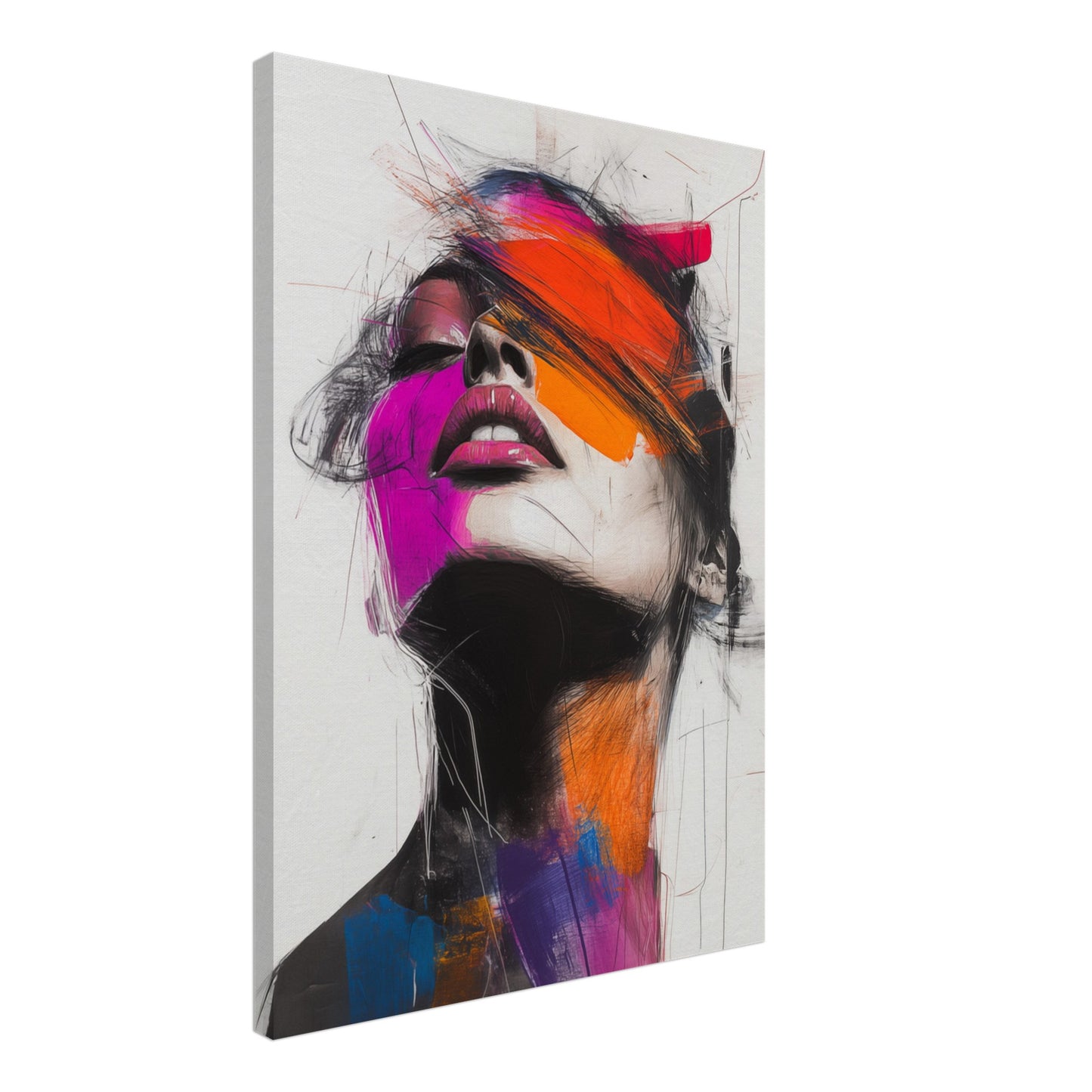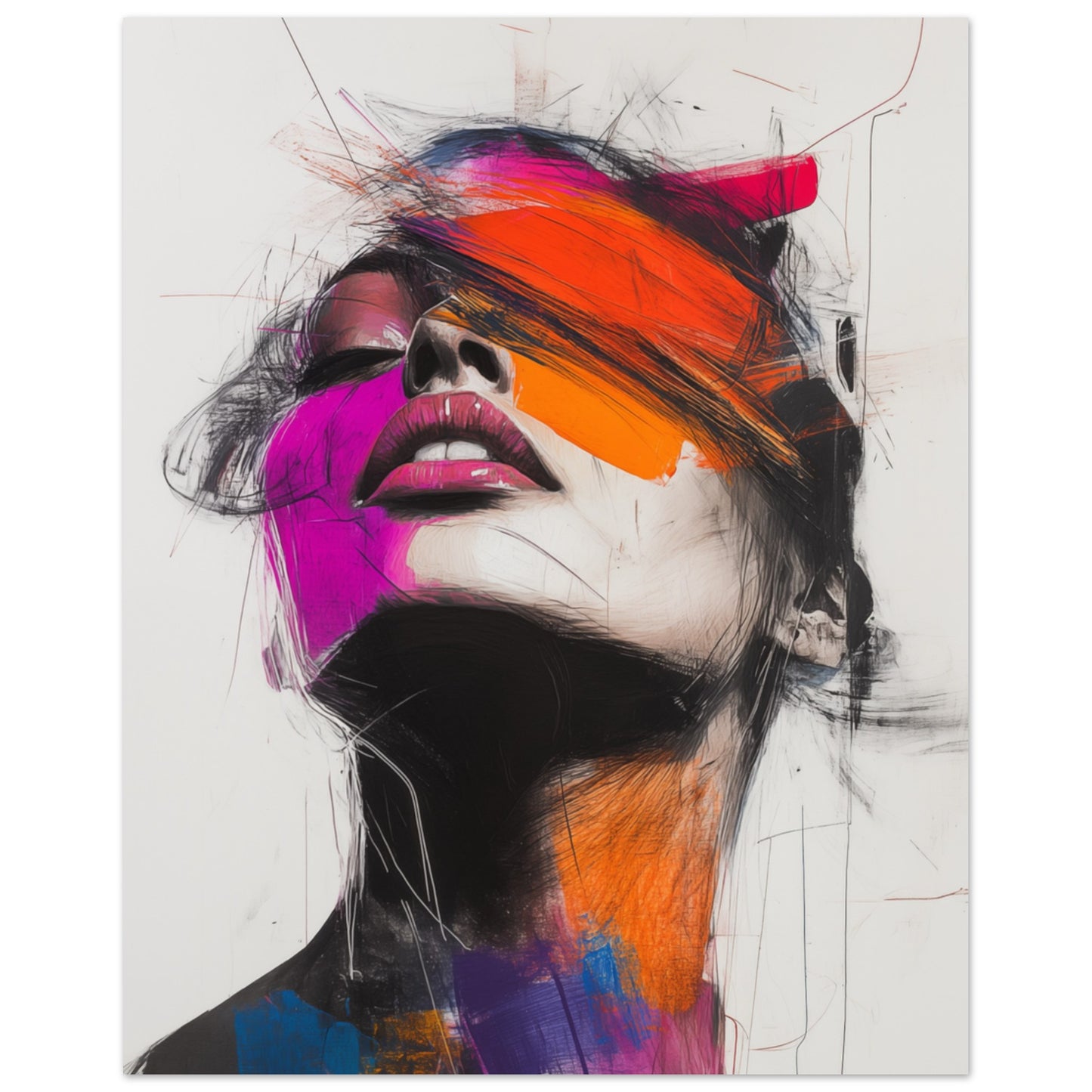"Abstract Color Explosion" est un portrait vibrant d'une femme, travaillant avec des couleurs intenses telles que l'orange vif et le magenta profond. La représentation partiellement obscurcie du visage et les coups de pinceau puissants créent une atmosphère dynamique et expressive. Le mélange d'accents de couleurs vives et de lignes fines confère à cette œuvre une touche moderne et avant-gardiste. Idéale pour les espaces recherchant une esthétique créative, énergique et moderne, cette œuvre d'art ajoutera une touche expressive à n'importe quel mur.