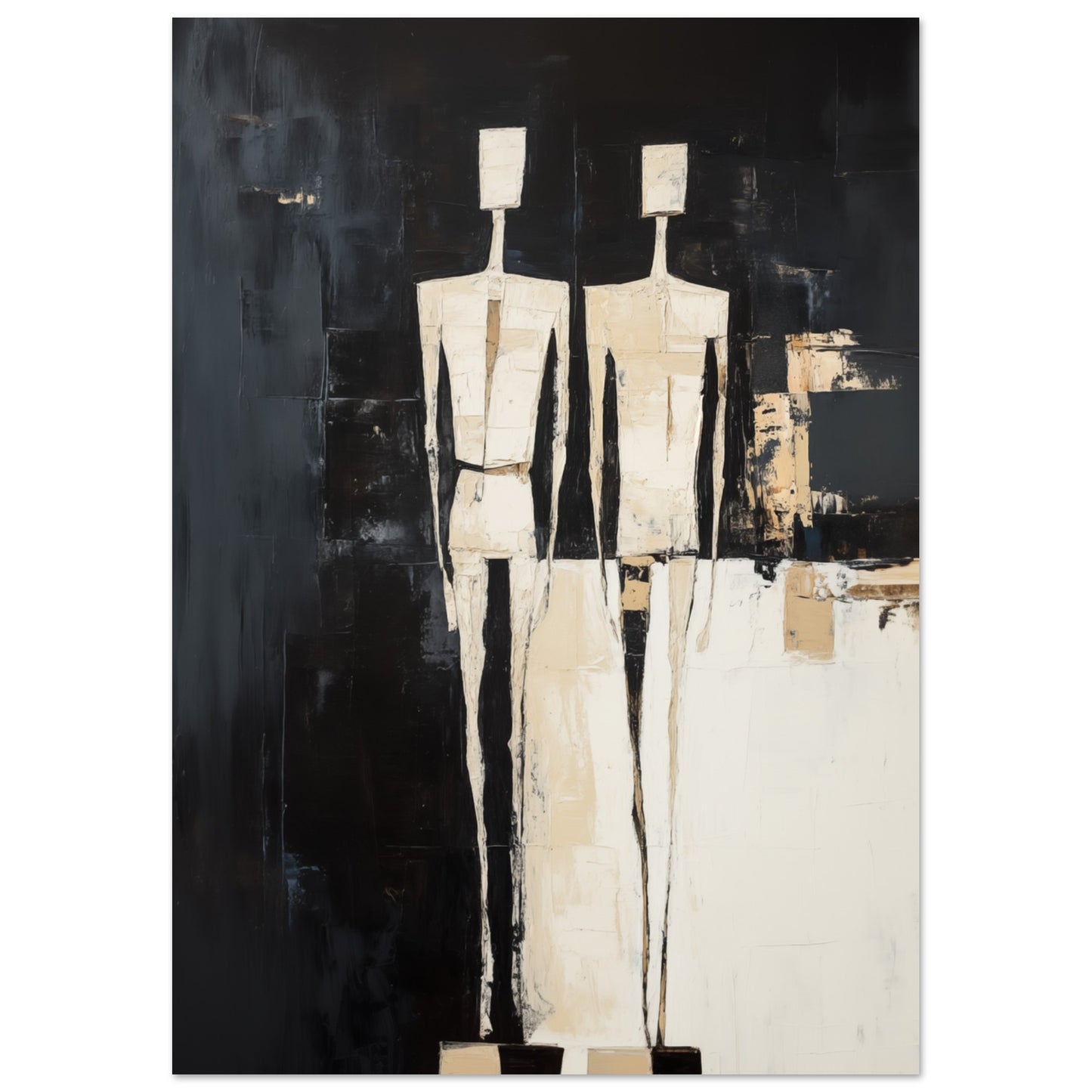 Deux figures géométriques stylisées se dressent dans un équilibre fascinant entre lumière et ombre. La palette de couleurs contrastées de noir, beige et blanc confère à l’œuvre une esthétique puissante et minimaliste. Parfait pour les espaces modernes avec une touche d'abstraction et de profondeur.