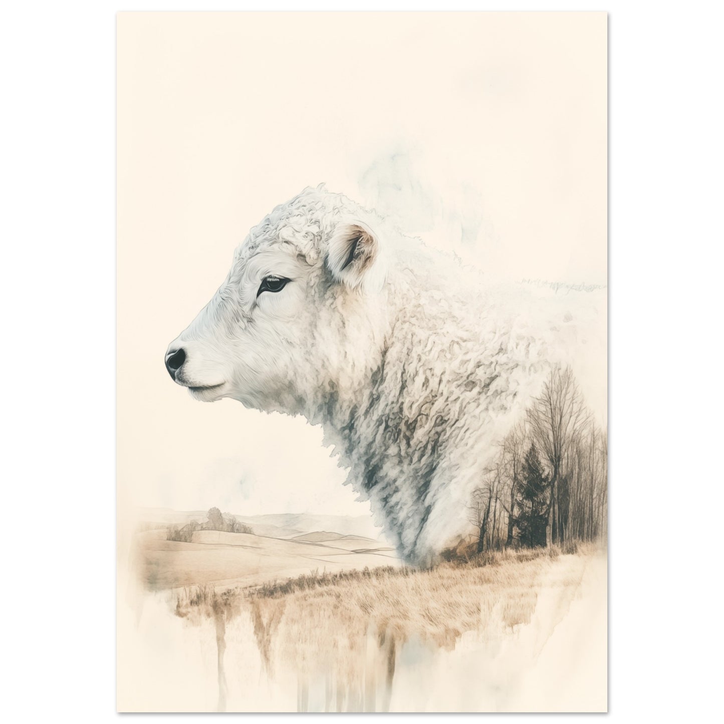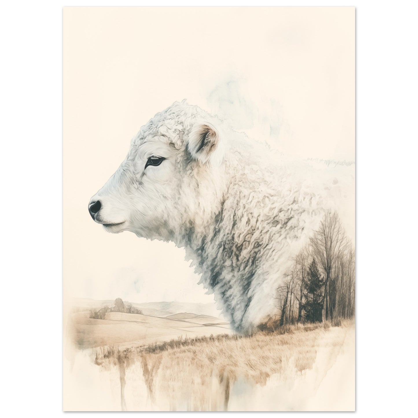 Une aquarelle unique qui capture la tranquillité de la nature. Cette image combine le profil d'un Galloway avec un paysage paisible dans un effet de double exposition harmonieux. Idéal pour les amoureux de la nature et tous ceux qui souhaitent donner à leur espace de vie une atmosphère rurale et détendue. Les tons terre doux s’intègrent parfaitement dans les concepts de design d’intérieur minimalistes ou rustiques.