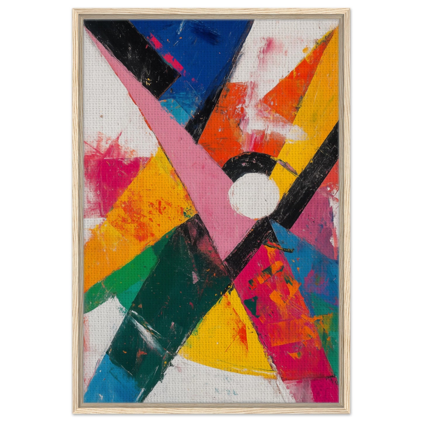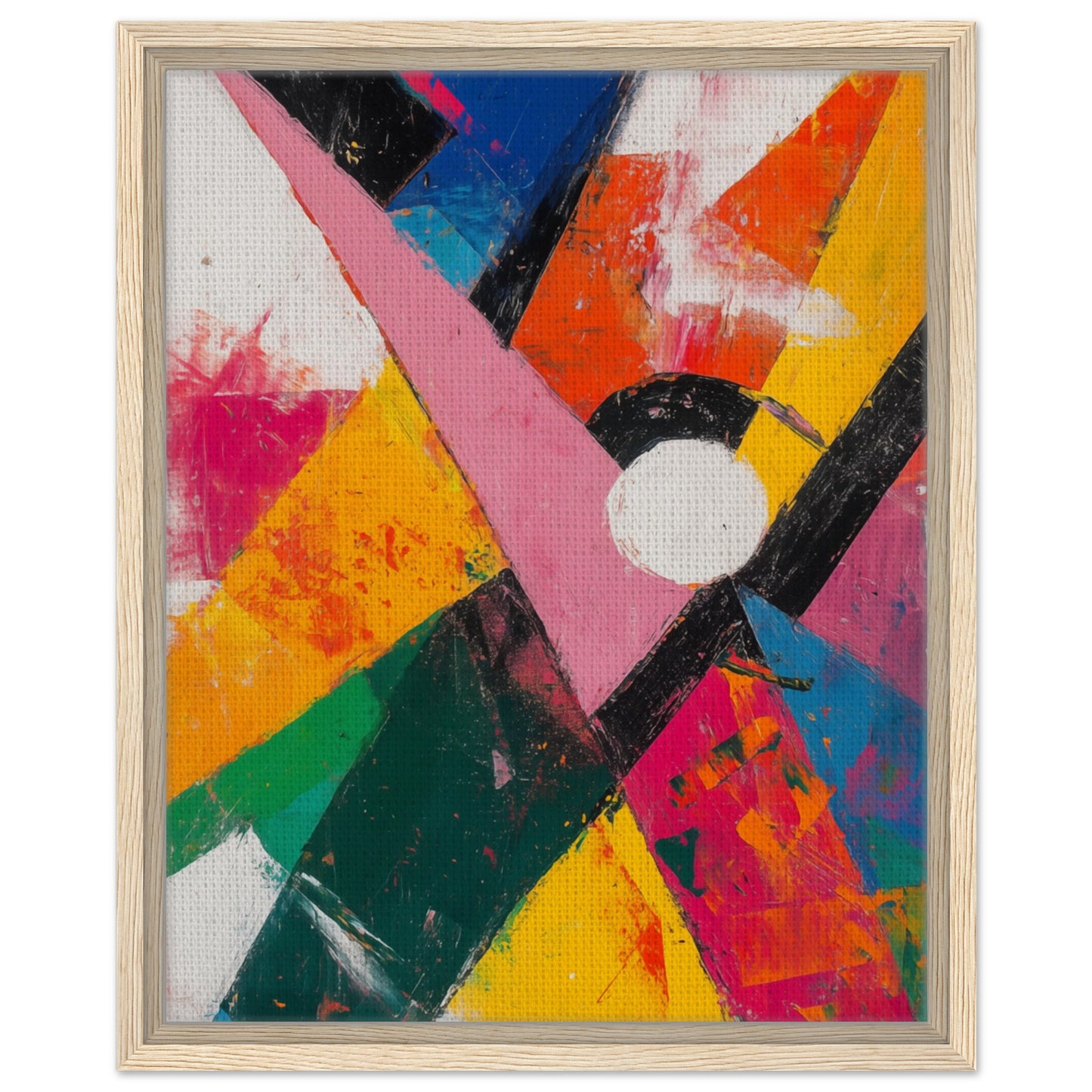 Cette image abstraite impressionne par ses couleurs fortes et ses formes dynamiques qui forment ensemble une composition expressive. Les jaunes, roses, bleus et oranges intenses sont contrastés par des lignes noires nettes, créant une sensation d'énergie et de mouvement. Cette œuvre d’art est parfaite pour faire une déclaration saisissante dans les espaces modernes.