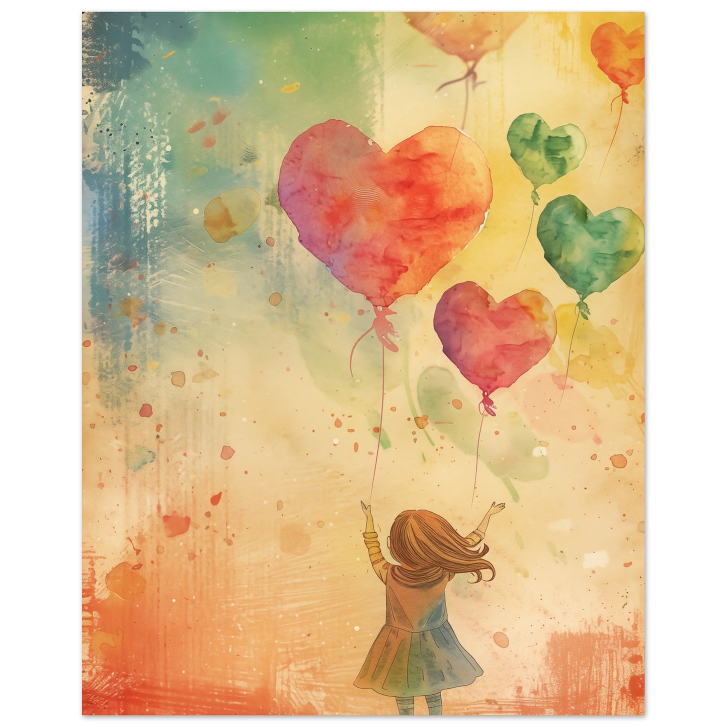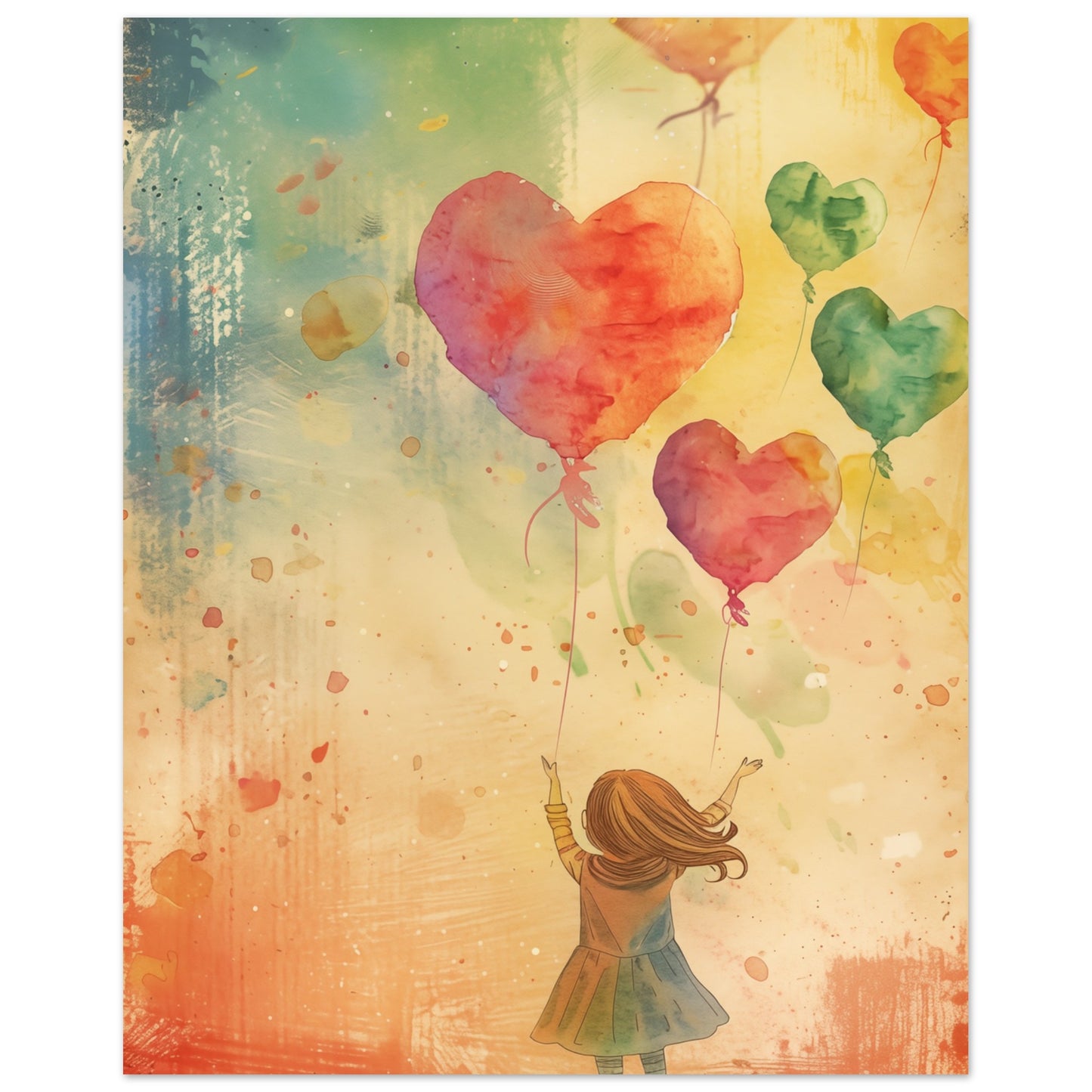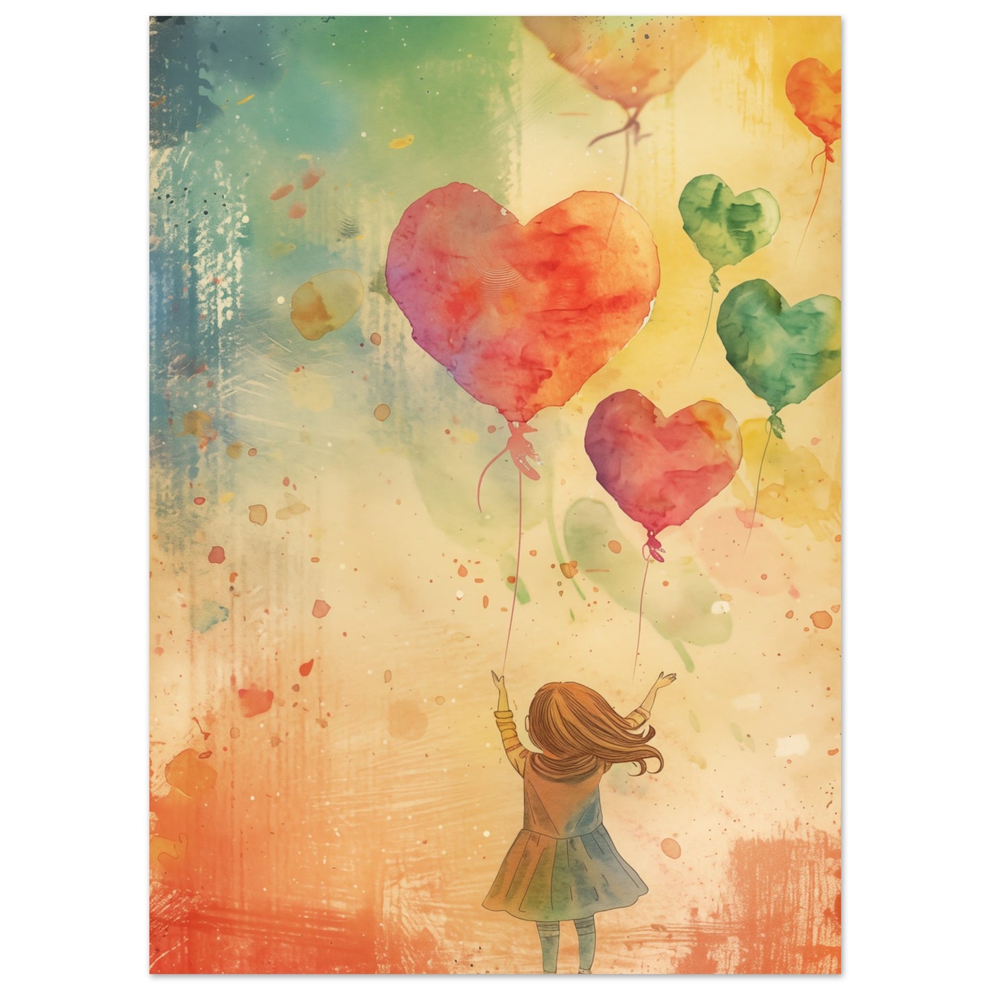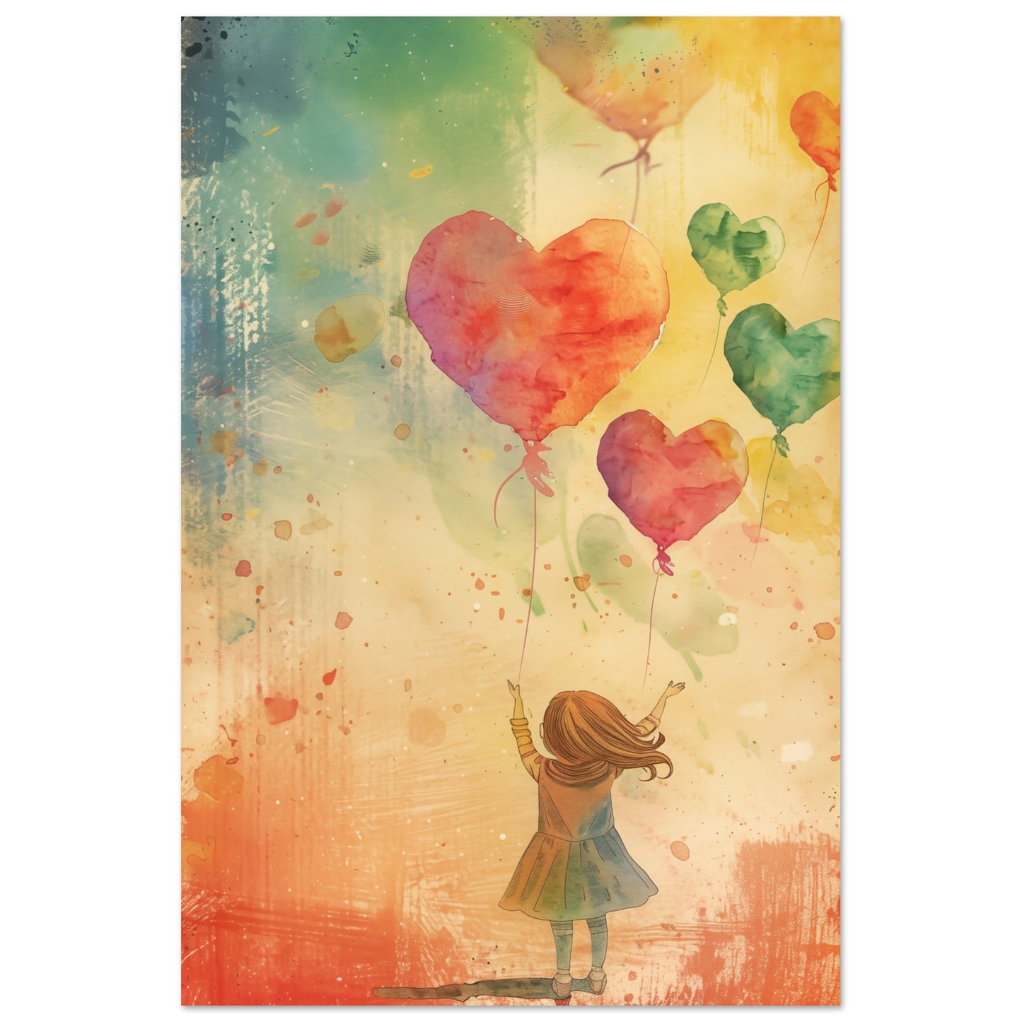 Lena, la fille aux grands rêves, laisse monter dans le ciel ses ballons en forme de cœur peints à la main. Chaque ballon porte un vœu qu'elle a écrit avec amour sur du papier coloré. Avec chaque ballon flottant, elle se sent un peu plus proche de ses rêves. Cette illustration réconfortante capture l'optimisme enfantin et le pouvoir des rêves et est idéale pour les chambres d'enfants qui souhaitent dégager une atmosphère positive et inspirante.