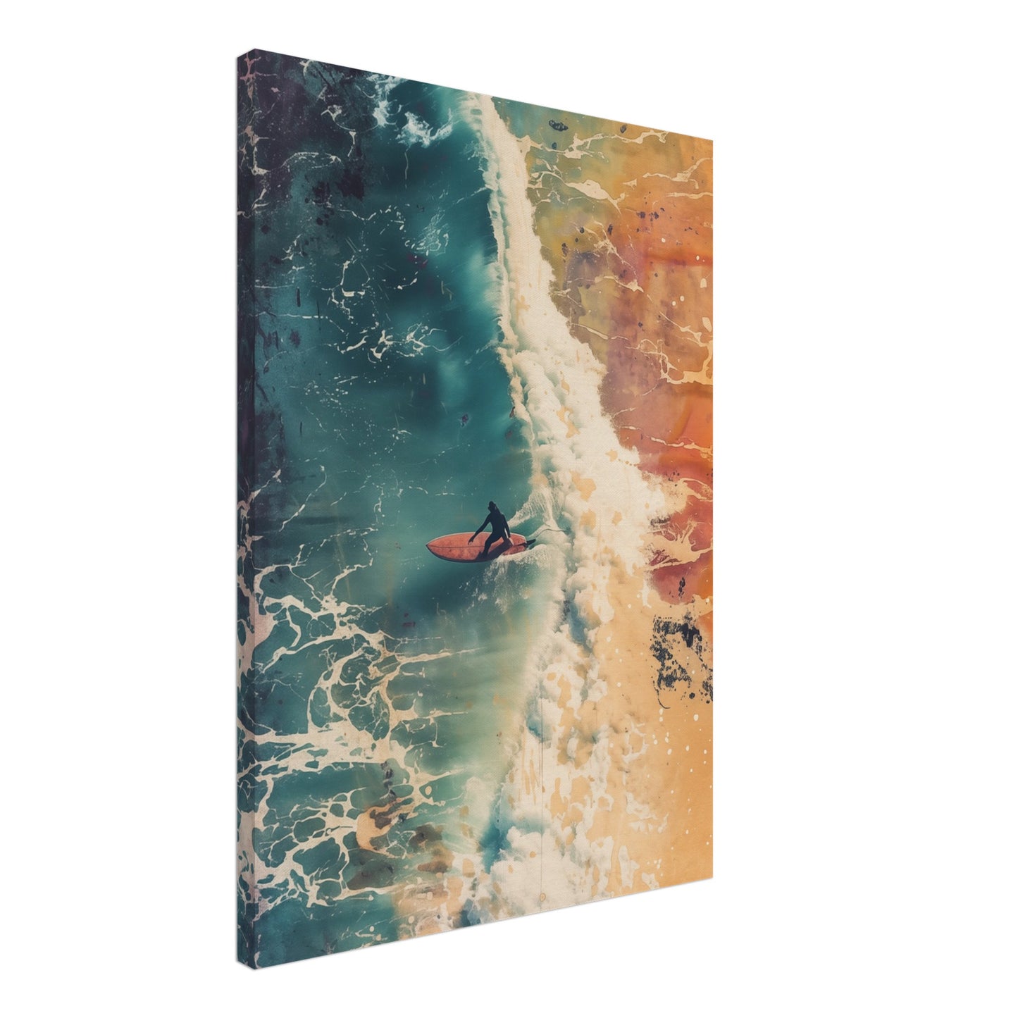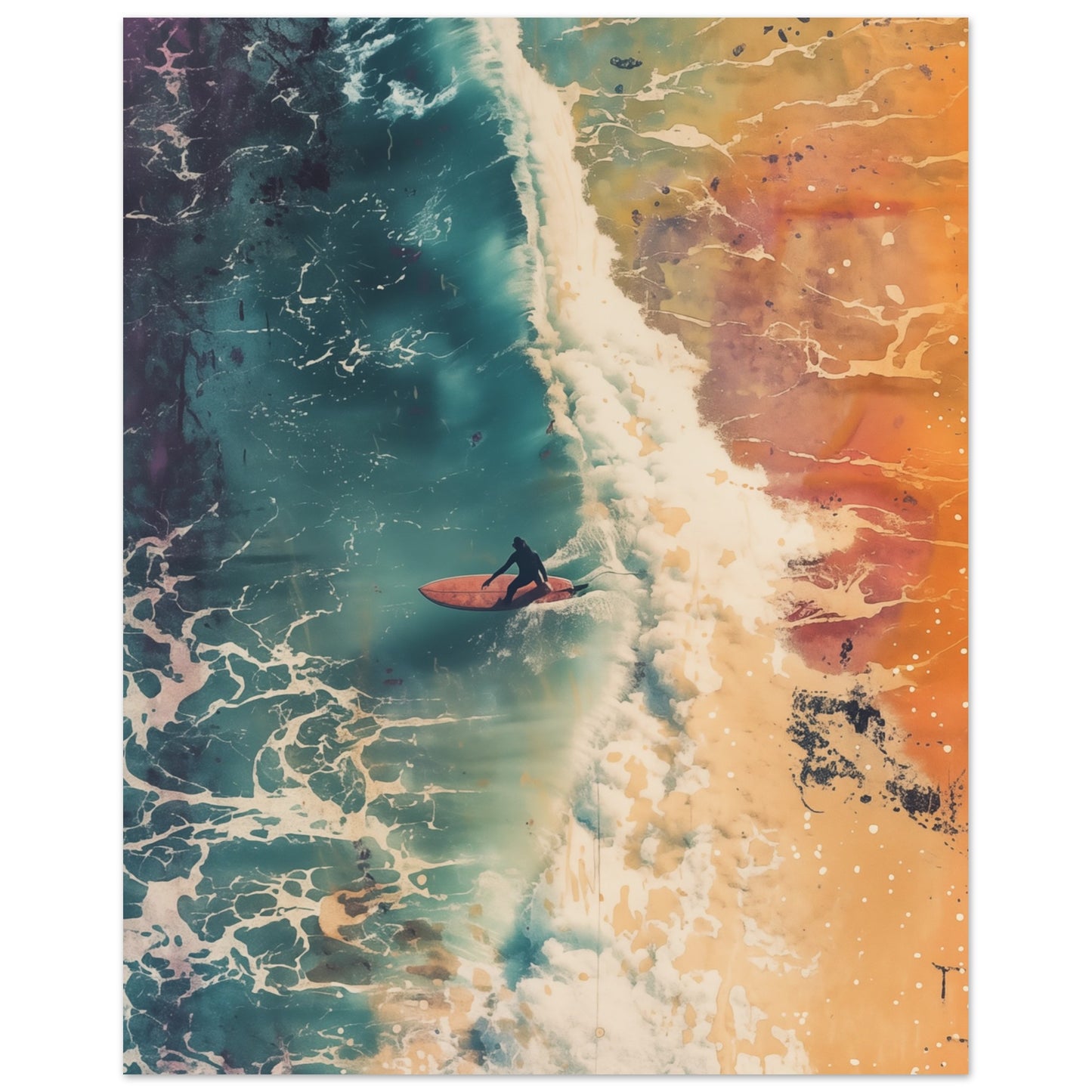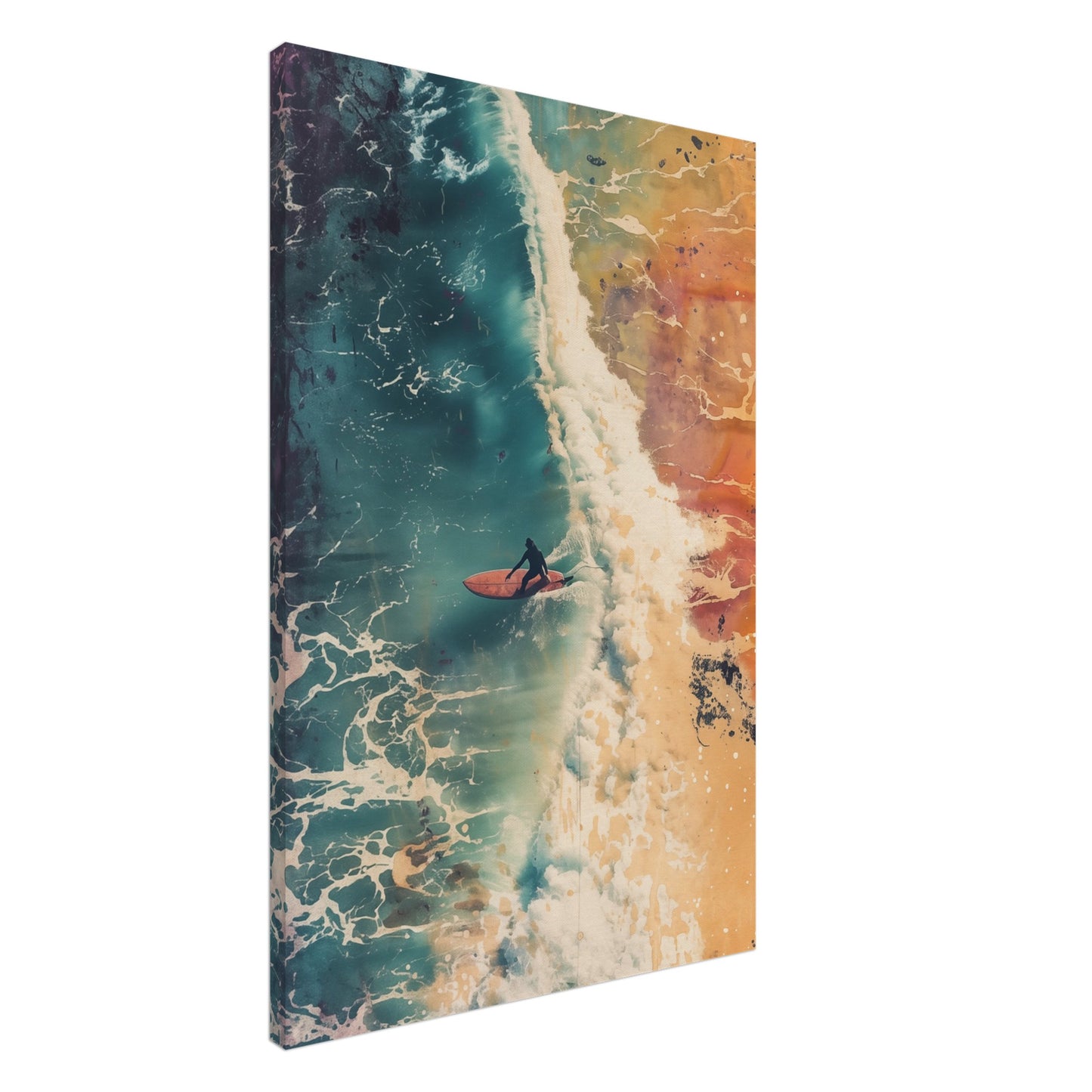 Cette œuvre d'art capture le drame du surf avec un dégradé intense de couleurs allant du bleu profond aux tons chauds de la terre. La composition dynamique met l'accent sur la puissance de l'océan et l'harmonie du surfeur avec les vagues. Les éclaboussures d'eau et les manœuvres fluides du surfeur confèrent à l'image une énergie vibrante qui reflète parfaitement le mouvement et la passion de surfer sur les vagues. Cette image est idéale pour les pièces qui souhaitent rayonner de dynamisme et d'aventure.