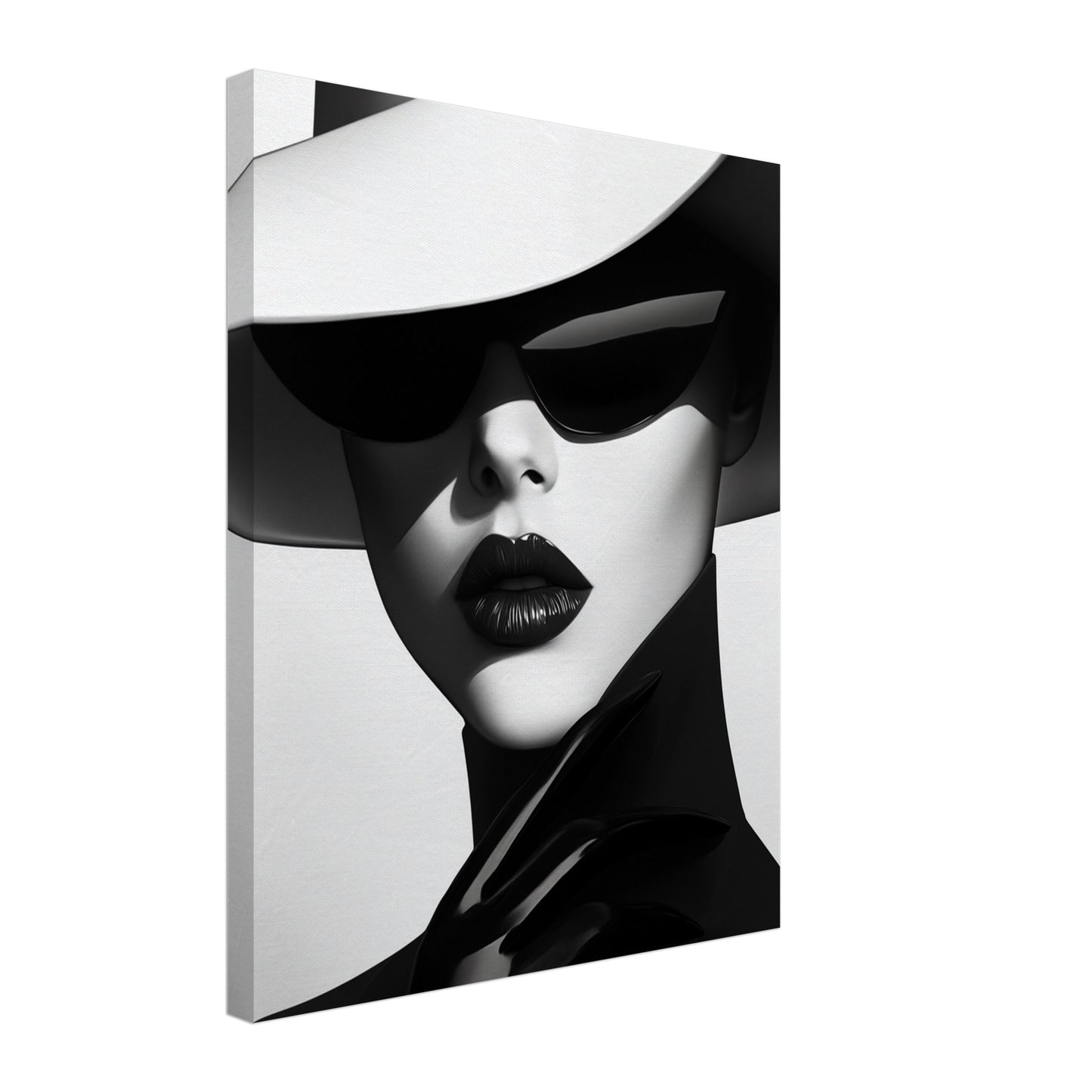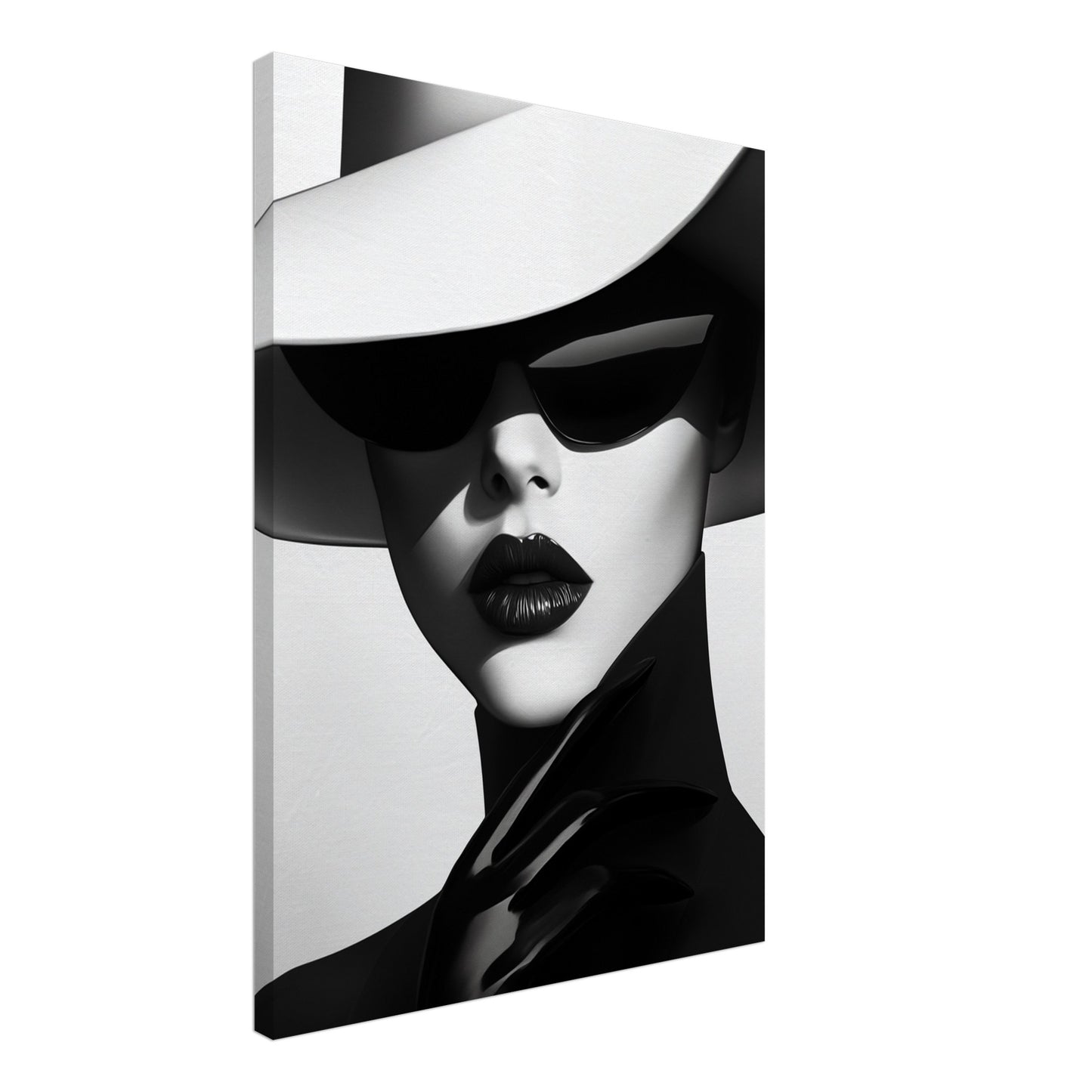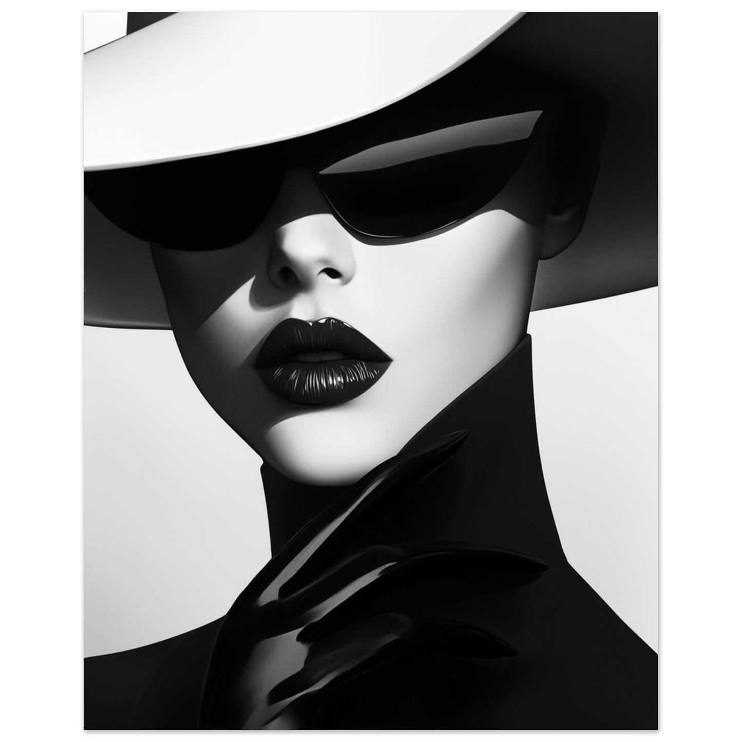"Modernité Élégante" est un portrait contemporain très stylisé représentant une femme mystérieuse en noir et blanc, vêtue d'un élégant chapeau et de lunettes de soleil. Les contrastes minimalistes entre le noir et le blanc, combinés à la brillance des lèvres et des gants, véhiculent une esthétique puissante et confiante. Cette image respire la sophistication et le design moderne, idéale pour les pièces qui ont besoin d'une touche de luxe et de mode.