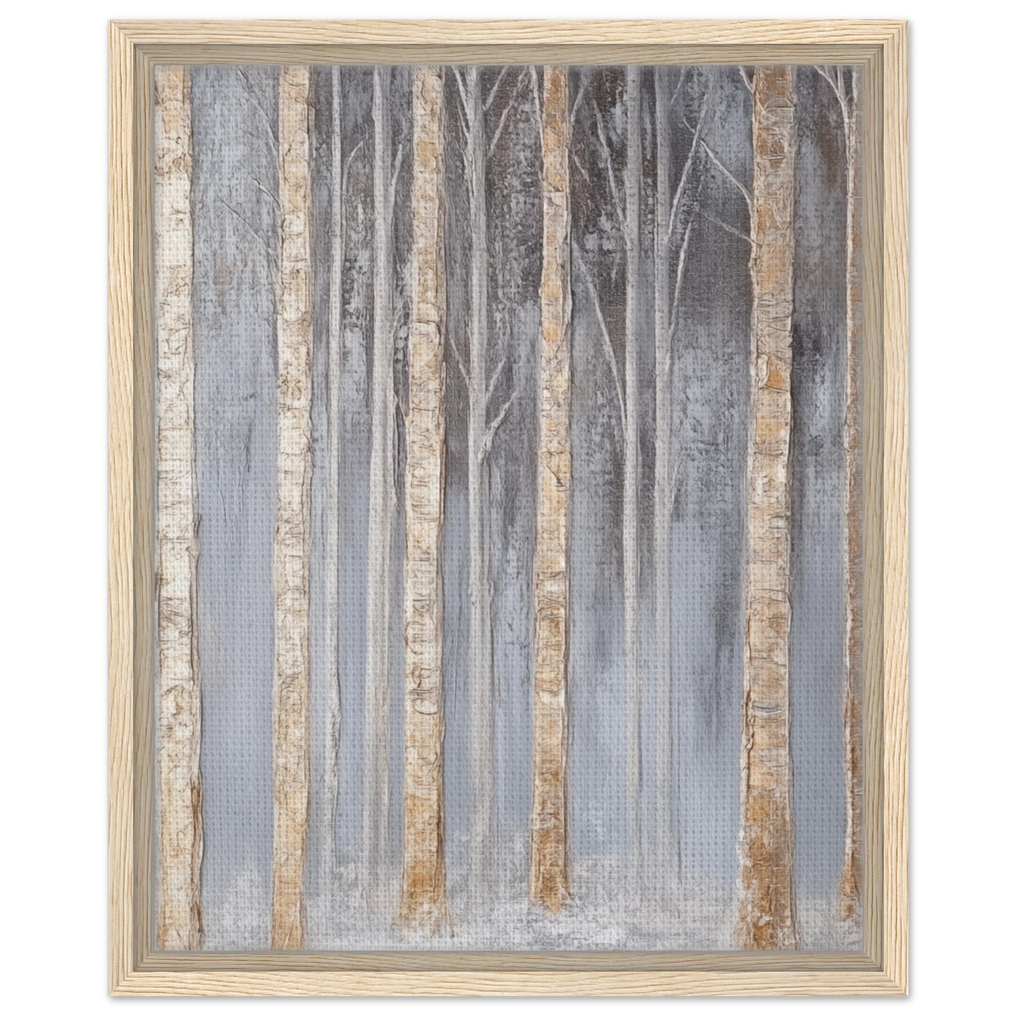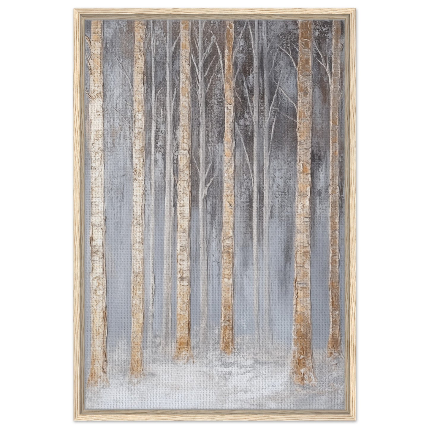 Cette image fascinante capture la beauté tranquille d’un paysage de bouleaux dans la brume. Les troncs d'arbres dorés contrastent magnifiquement avec le fond gris, créant une composition à la fois paisible et dynamique. Idéale pour les espaces de vie, les bureaux ou les chambres modernes , cette œuvre d'art ajoute une touche élégante à n'importe quelle pièce.