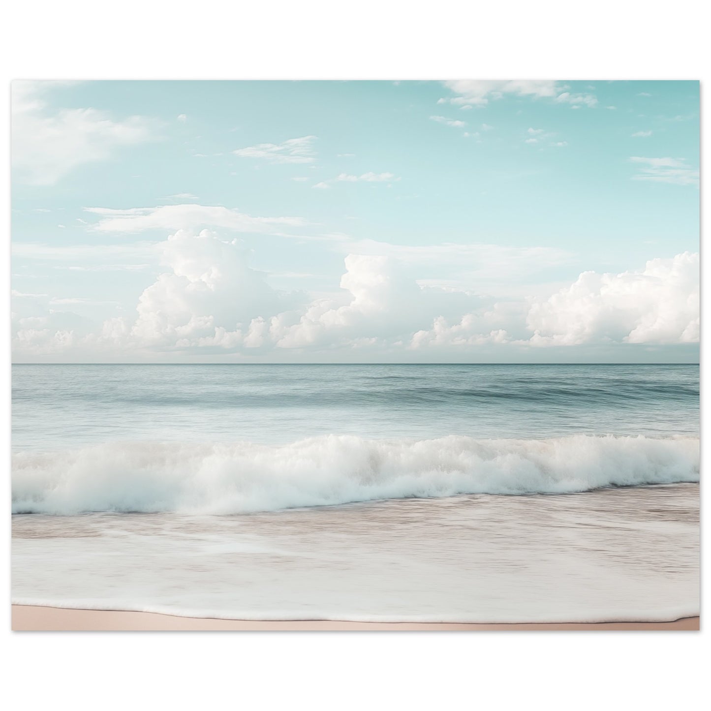 Cette magnifique impression d’art capture le calme de l’océan dans des tons pastel doux. Les douces vagues roulent sur la plage tandis que le ciel large aux nuages ​​délicats embellit l'horizon. Parfait pour tous ceux qui souhaitent apporter la beauté de la mer et les effets relaxants de la nature dans leur maison. Cette image est idéale pour ajouter une atmosphère paisible et rafraîchissante aux salons ou aux chambres et capturer le pouvoir du silence. Un regard sur cette œuvre d’art apporte sérénité et espace à n’importe quelle pièce.