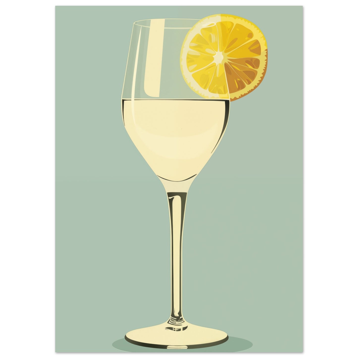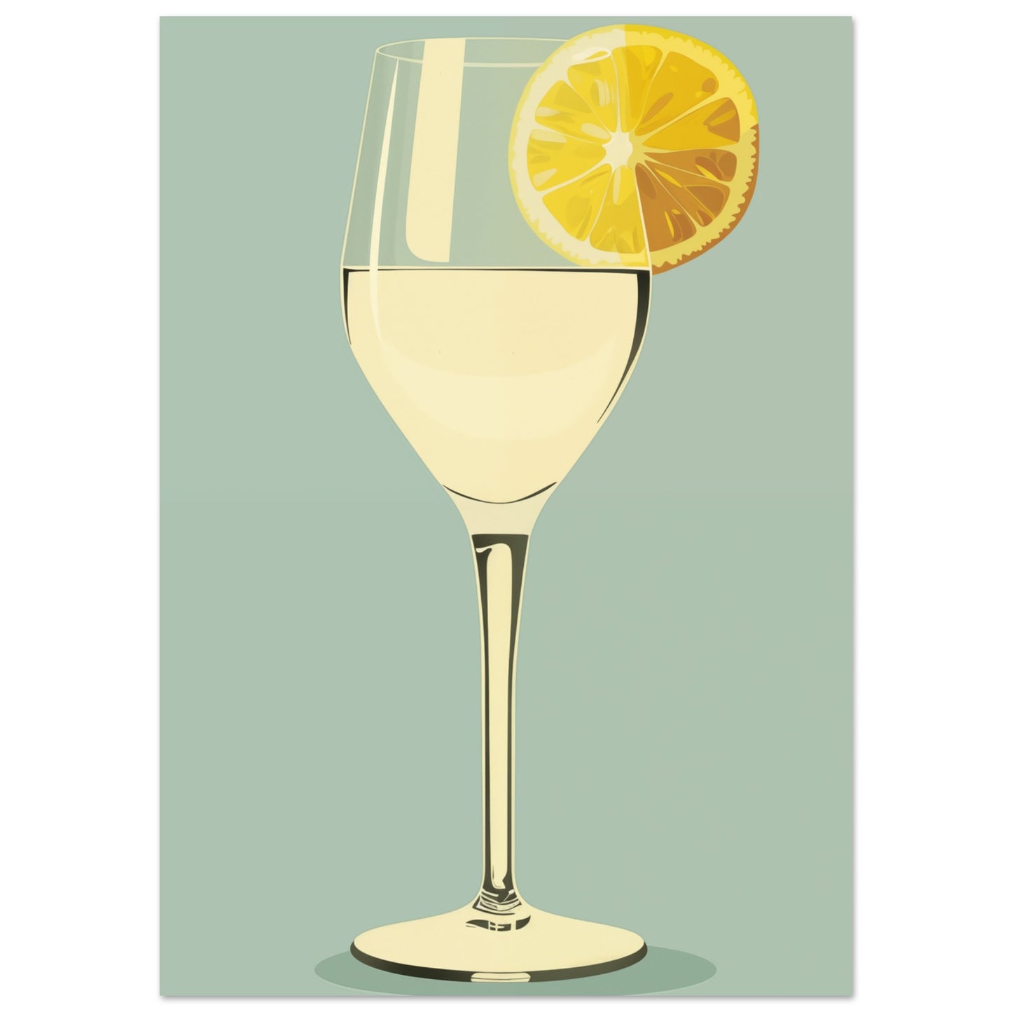 Cette illustration élégante d'un verre à vin blanc avec un liquide brillant et rafraîchissant et une tranche de citron sur le bord transmet élégance et fraîcheur. Le fond d’un vert pastel doux renforce le design minimaliste et moderne, conférant à l’œuvre une atmosphère calme et invitante. Parfaite pour les cuisines, bars ou espaces de vie modernes, cette image apportera une touche sophistiquée et une esthétique rafraîchissante à votre maison. Idéal pour les amateurs d’illustrations simples et stylées et de décorations de vin élégantes.