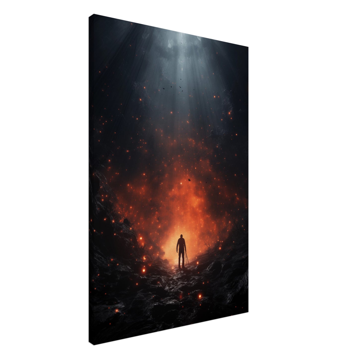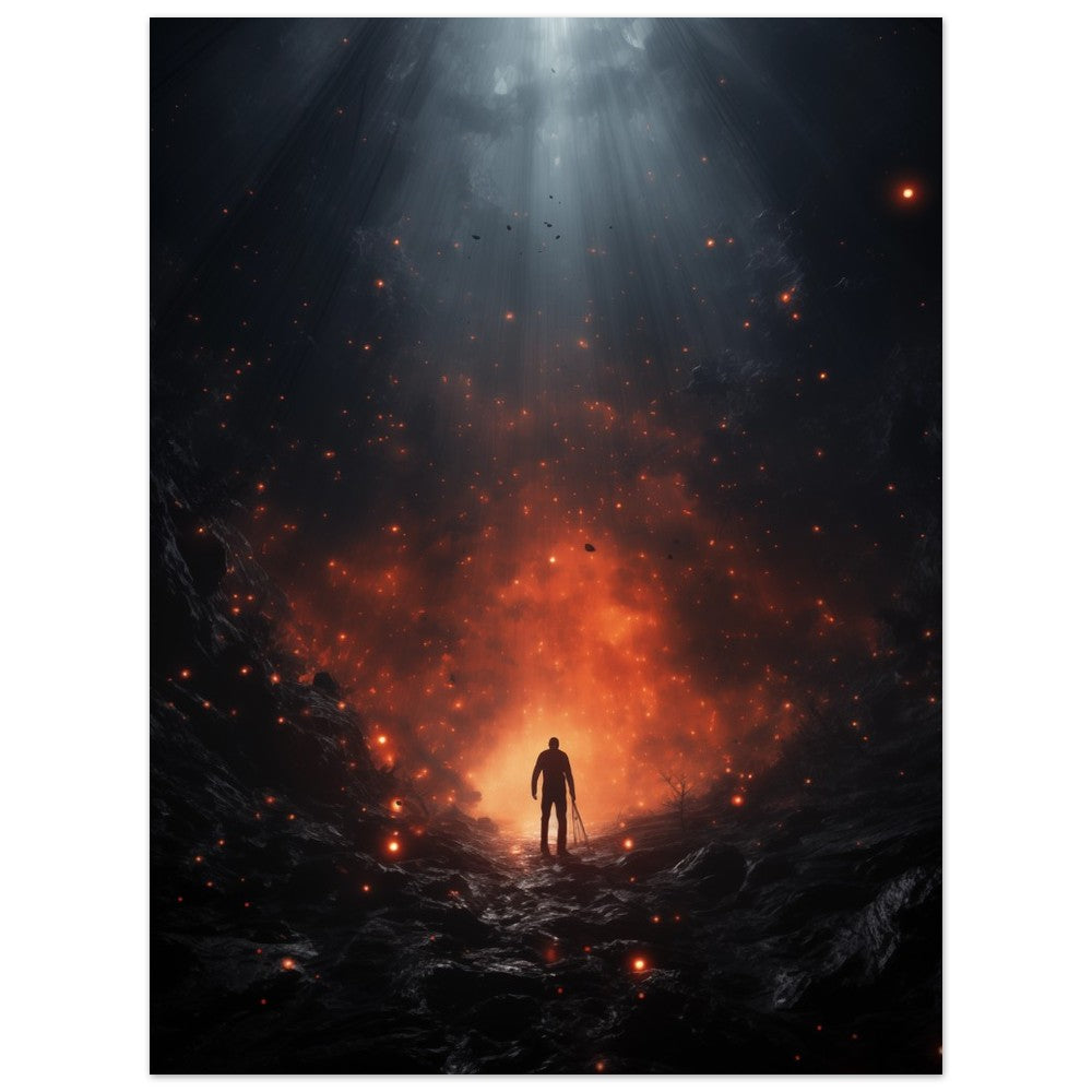 Caius, der Wanderer der Aschewelten, steht am Rande einer glühenden Schlucht in einer sterbenden Welt. Seine Silhouette hebt sich vor den lodernden Flammen ab, während er auf der Suche nach Reinigung und Wiedergeburt durch das Feuer schreitet. Dieses Poster fängt den Moment ein, in dem Mut und Entschlossenheit auf die verzehrenden Prüfungen der Welt treffen. Perfekt für Liebhaber von Fantasy-Kunst und epischen Geschichten.